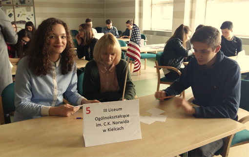 We wtorek, 08.03.2016, uczniowie z naszej szkoły: Aleksandra Krajewska (1G), Aleksandra Gołąbek (1G) oraz Mateusz Zajęcki (1D) wzięli udział w II edycji konkursu wiedzy o Stanach Zjednoczonych Zoom in on America Challenge.