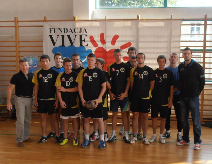 Na zdjęciu reprezentacja III L.O. wraz z opiekunem p. Andrzejem Krawczyńskim (pierwszy z lewej), oraz z reprezentantem Polski - zawodnikiem Vive Targi Kielce - Michałem Jureckim (pierwszy z prawej).