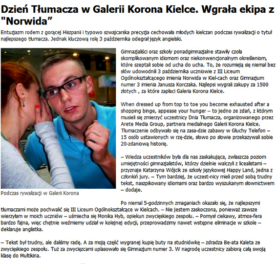 To pierwsza tego typu rywalizacja do udziału w której zaproszeni zostali uczniowie kieleckich szkół gimnazjalnych oraz ponadgimnazjalnych. 15-osobowe drużyny zmierzyły się ze specjalnie dla nich przygotowaną historią w języku angielskim. Ich zadaniem było jak najwierniejsze przetłumaczenie jej na język polski. Tłumaczenie odbywało się w formie zabawy w Głuchy Telefon. Uczestnicy na ucho przekazywali sobie po kolei zdanie po zdaniu, wspólnie mierząc się ze słownymi i gramatycznymi niuansami.