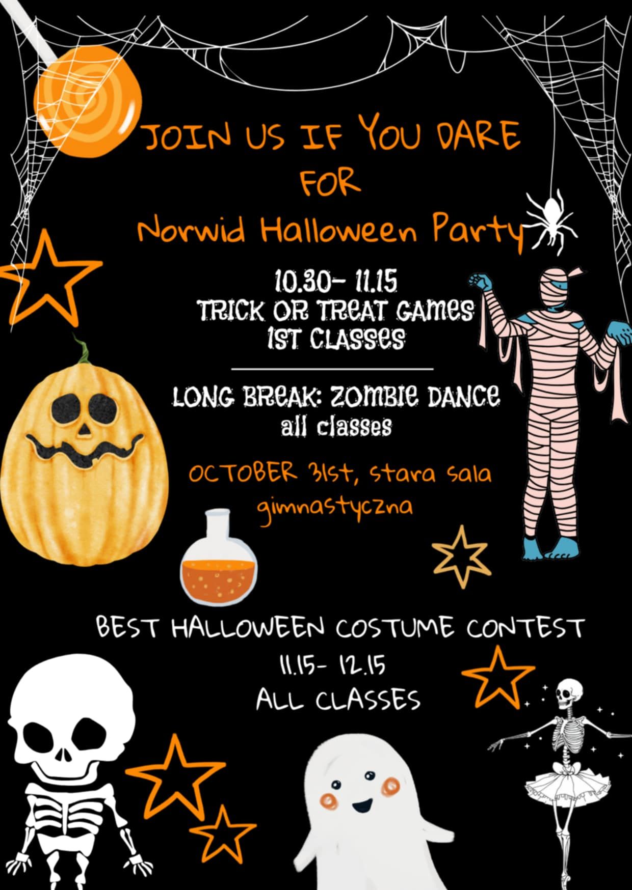 Halloween Party Time w Norwidzie! Każdy może się przebrać i wziąć udział w konkursie na najlepsze przebranie. Klasy 1 zapraszamy na Trick or Treat Games na starej sali gimnastycznej.