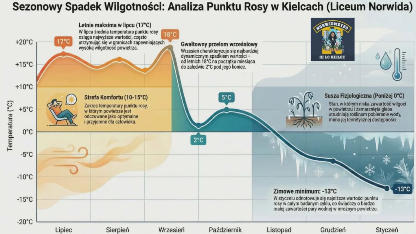 Odpowiedź nie leży w temperaturze, ale w PUNKCIE ROSY (Dew Point)! 📉 Nasza stacja III LO Norwid przeanalizowała ostatnie miesiące i mamy dla Was konkretne wnioski.
