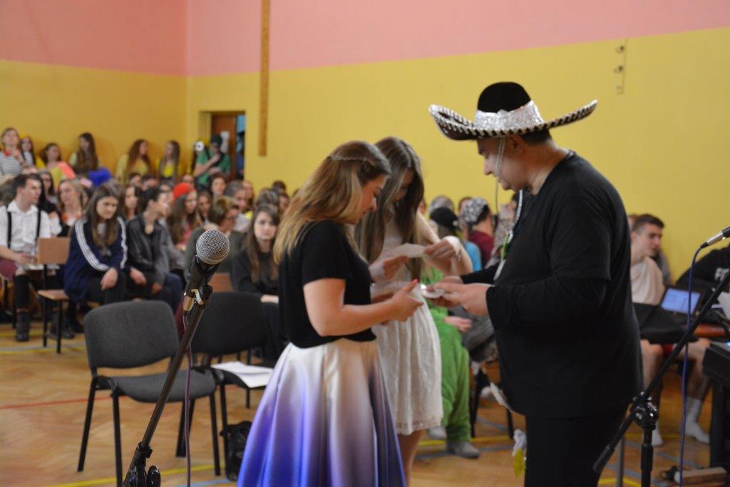 W trakcie imprezy zostały wręczone nagrody dla najlepszych twórców plakatu i parodii. Jednak należy podkreślić, że tego dnia wszyscy uczniowie klas drugich odnieśli wielki sukces, ponieważ wykazali się zmysłem organizacyjnym, pięknie zaprezentowali się na scenie i byli oryginalnie przebrani. Gratulacje dla wszystkich !Mamy nadzieję, że to spotkanie zachęci naszych uczniów do nauki języków obcych poprzez piosenkę. I nie zapominajmy słów Jeremiego Przybory z Kabaretu Starszych Panów : «Piosenka jest dobra na wszystko. Piosenka pomoże na wiele, na co dzień i na niedzielę.»