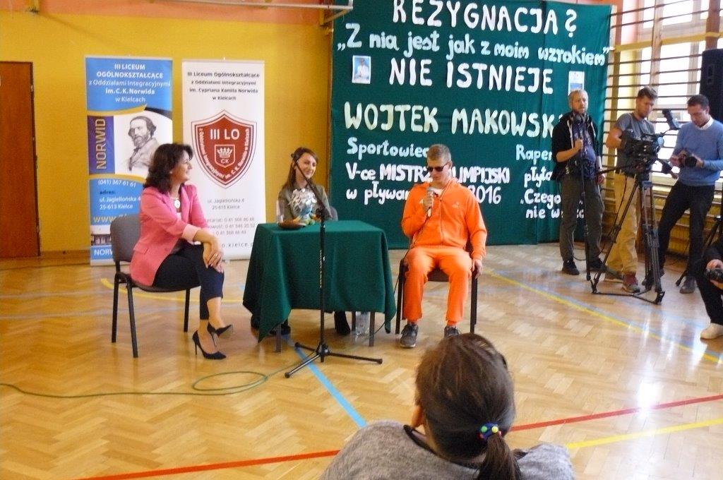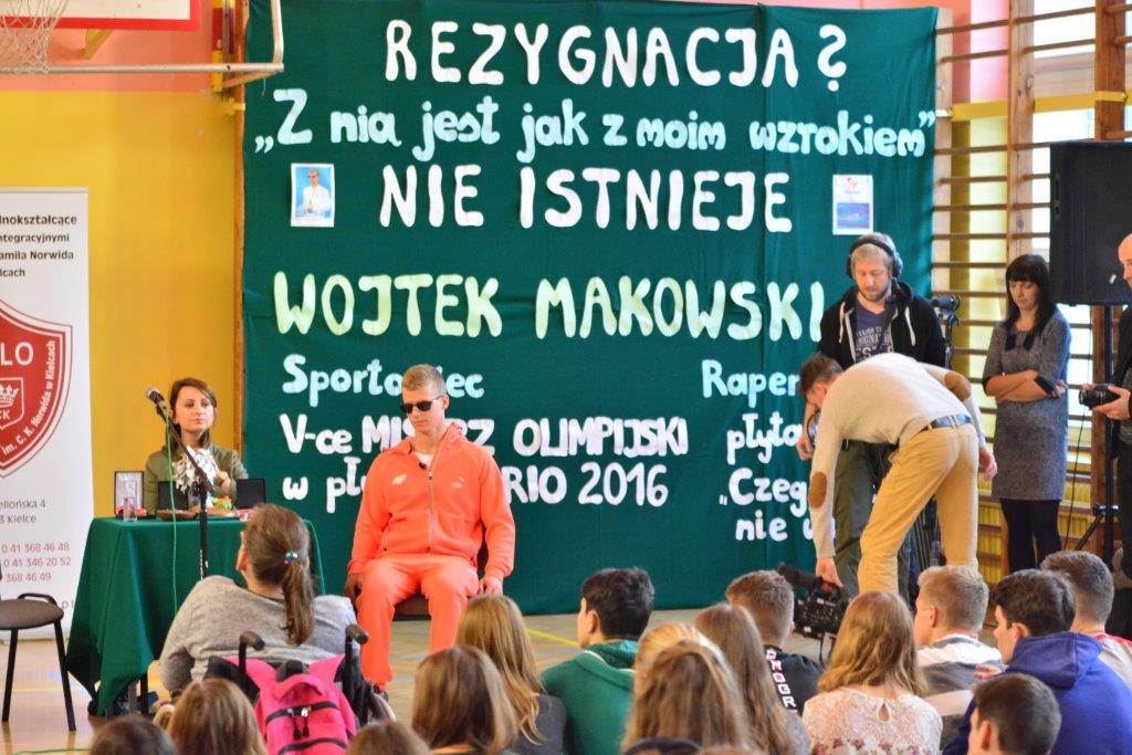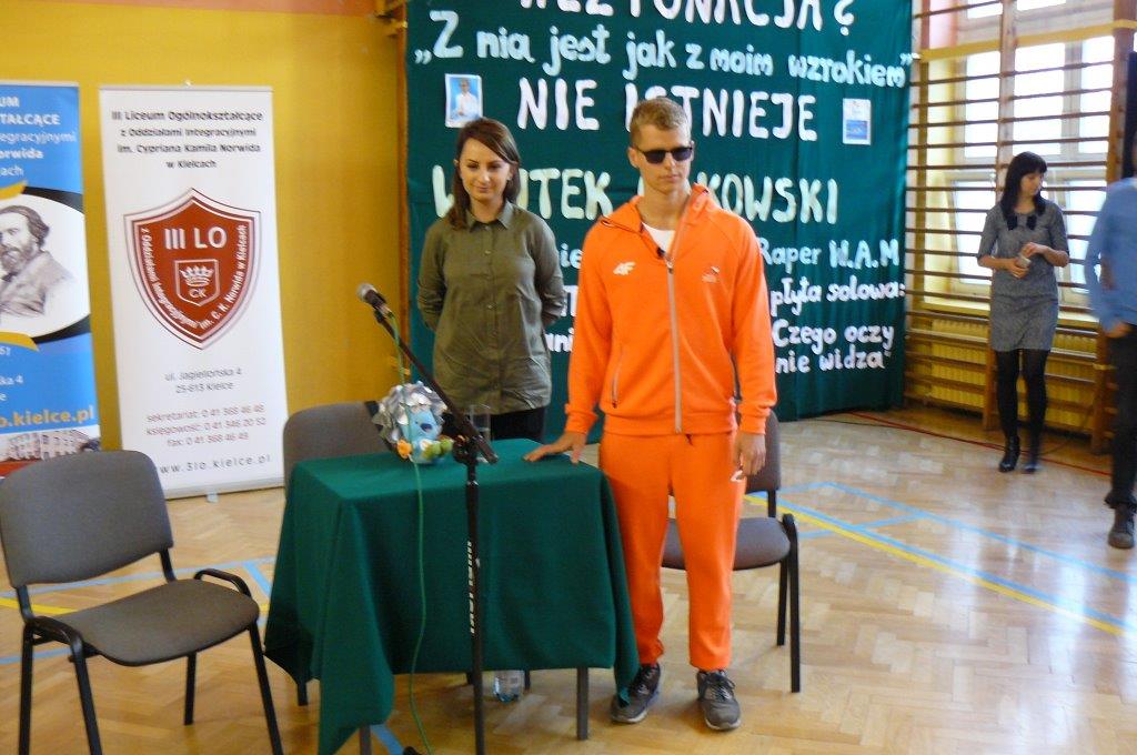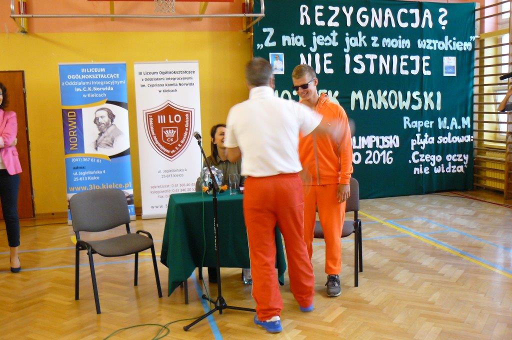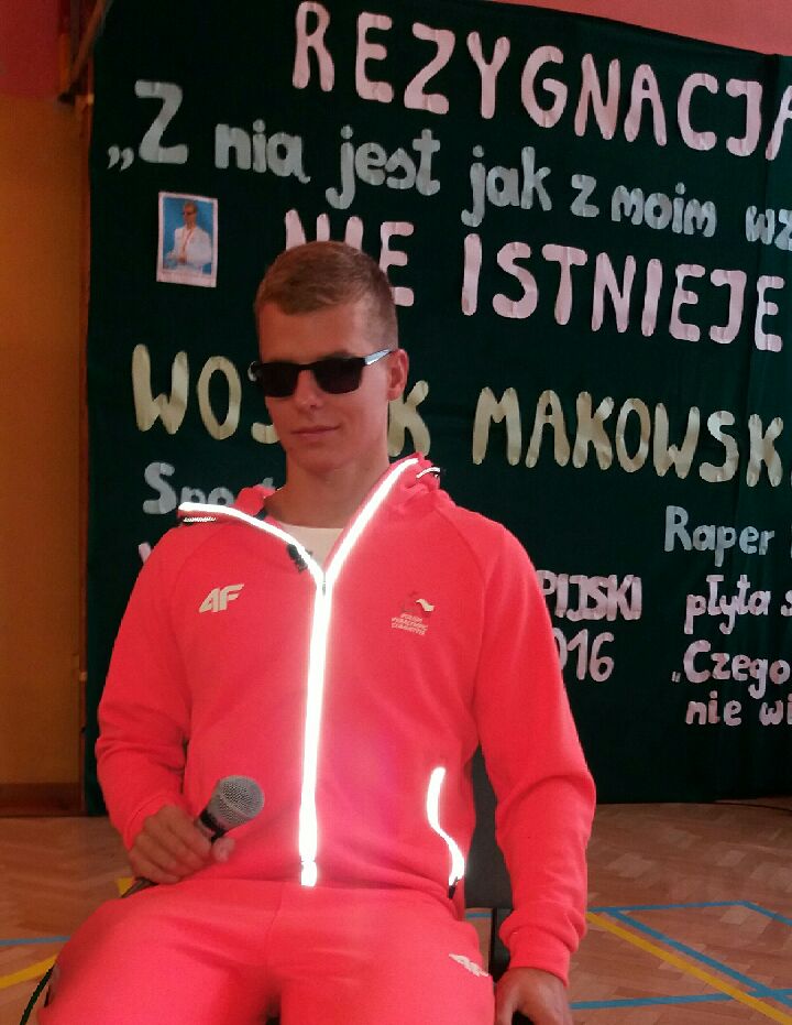 Sportowiec i miłośnik sportu, kibic „Korony” i „Vive” Tauron Kielce, raper, obdarzony niezwykłym poczuciem humoru, wrażliwy, niebywale inteligentny, optymista, jak podają różne media „wprost zaraża pozytywnym spojrzeniem na świat”,wspaniały uczeń. Wojtek Makowski. Człowiek, który niepełnosprawności na pewno nie kojarzy z żadnymi problemami czy ograniczeniami. Absolwent naszej szkoły: matura 2011. Student zarządzania na Uniwersytecie Warszawskim.Wojtek udowadniał nam wszystkim, że „nie móc” to tylko znaczy „nie chcieć”. Bardzo lubiany i podziwiany przez kolegów, uwielbiany przez nauczycieli, zawsze garnął się do udziału we wszystkich szkolnych wydarzeniach. Wspaniale czuje się w literaturze, nic więc dziwnego, że sam zaczął tworzyć teksty piosenek. Nagrywa też teledyski. Wszechstronny, a przy tym niebywale skromny. Cudowny gość.