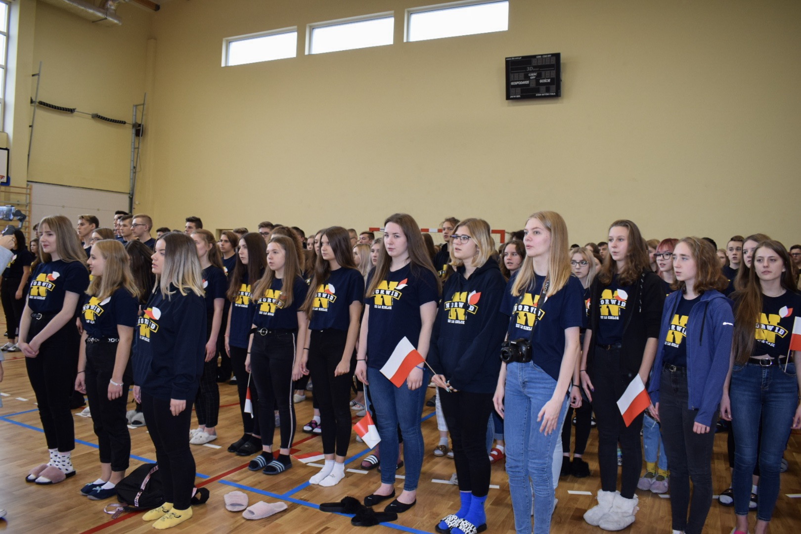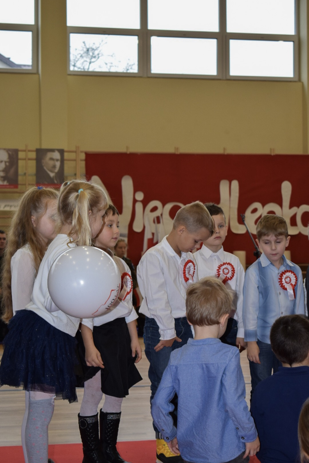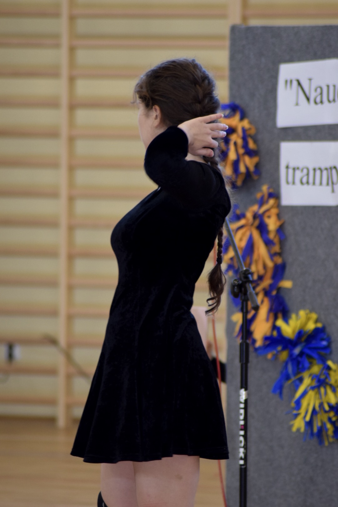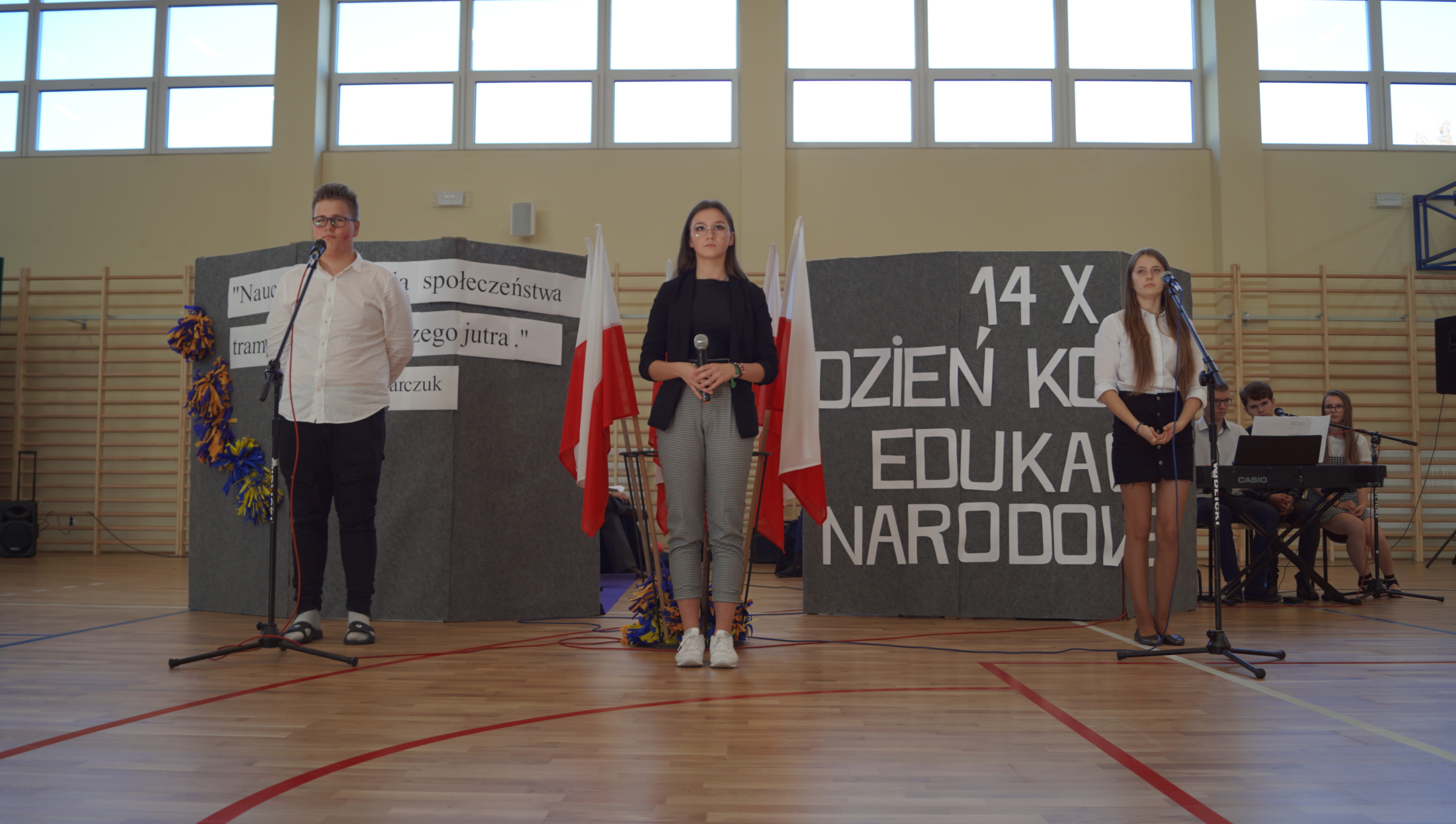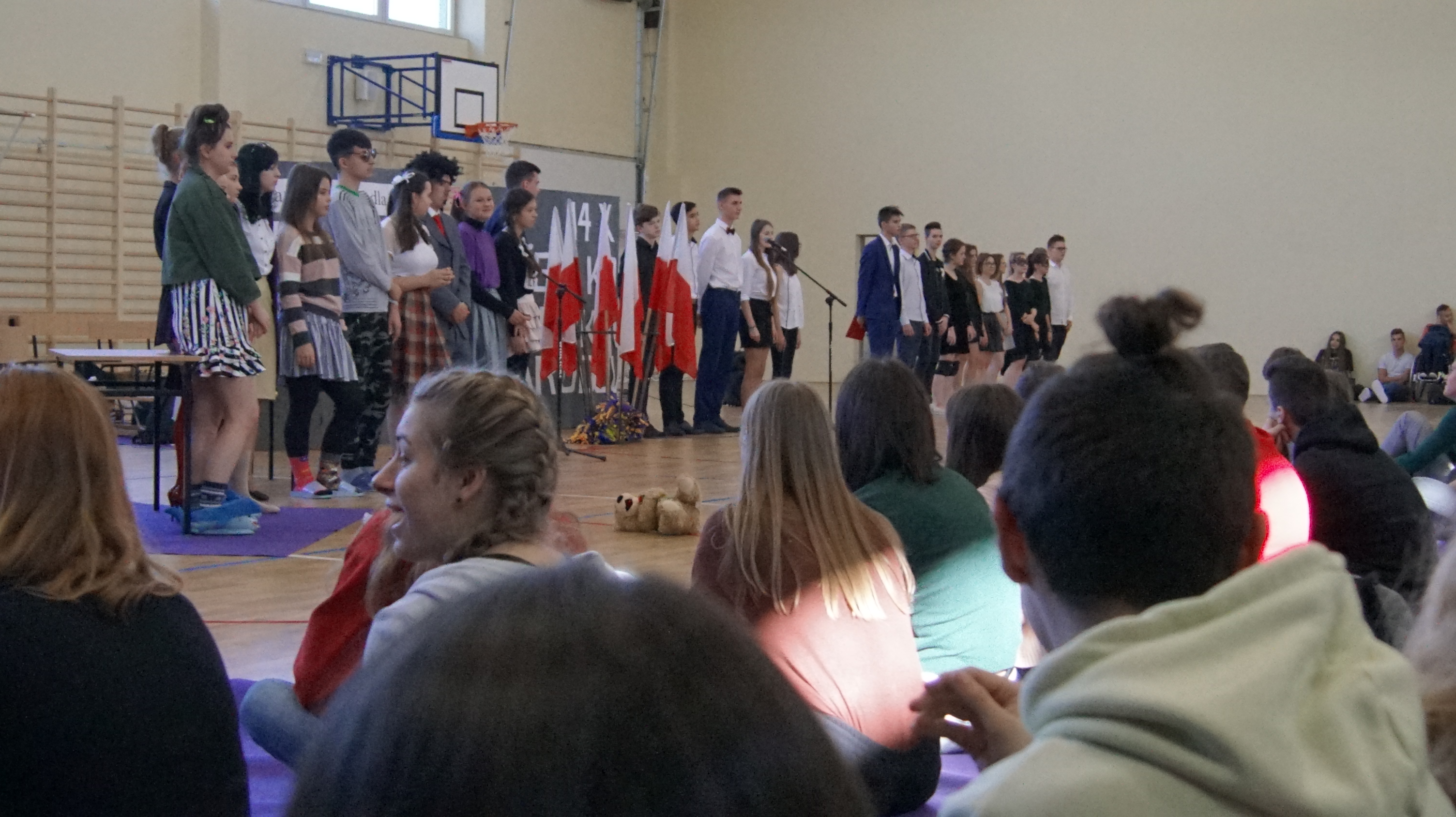 Osobno, z nauczycielami wychowania fizycznego, ćwiczyli swoje wejście nasi sportowcy. W jednym miejscu i czasie należało zmieścić i zgrać zawodników uprawiających różne dyscypliny: siatkówkę, piłkę ręczną i nożną, koszykówkę, akrobatki oraz dziewczęta przygotowujące pokaz ze wstążkami. Nawet dekoracja, w całości przygotowana przez J. Kopycińską, miała swoje próby rozmiaru, wytrzymałości i stabilności.
