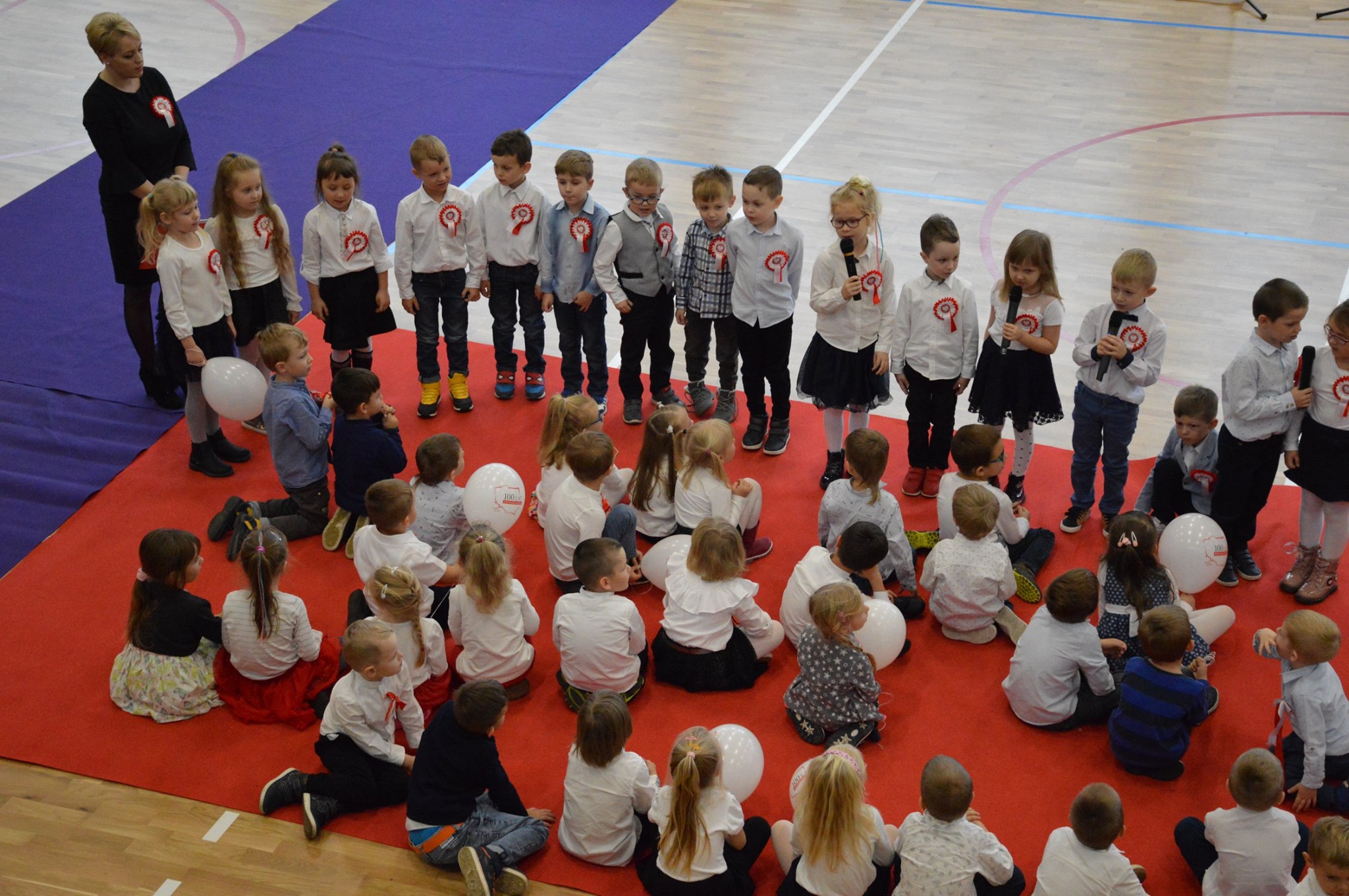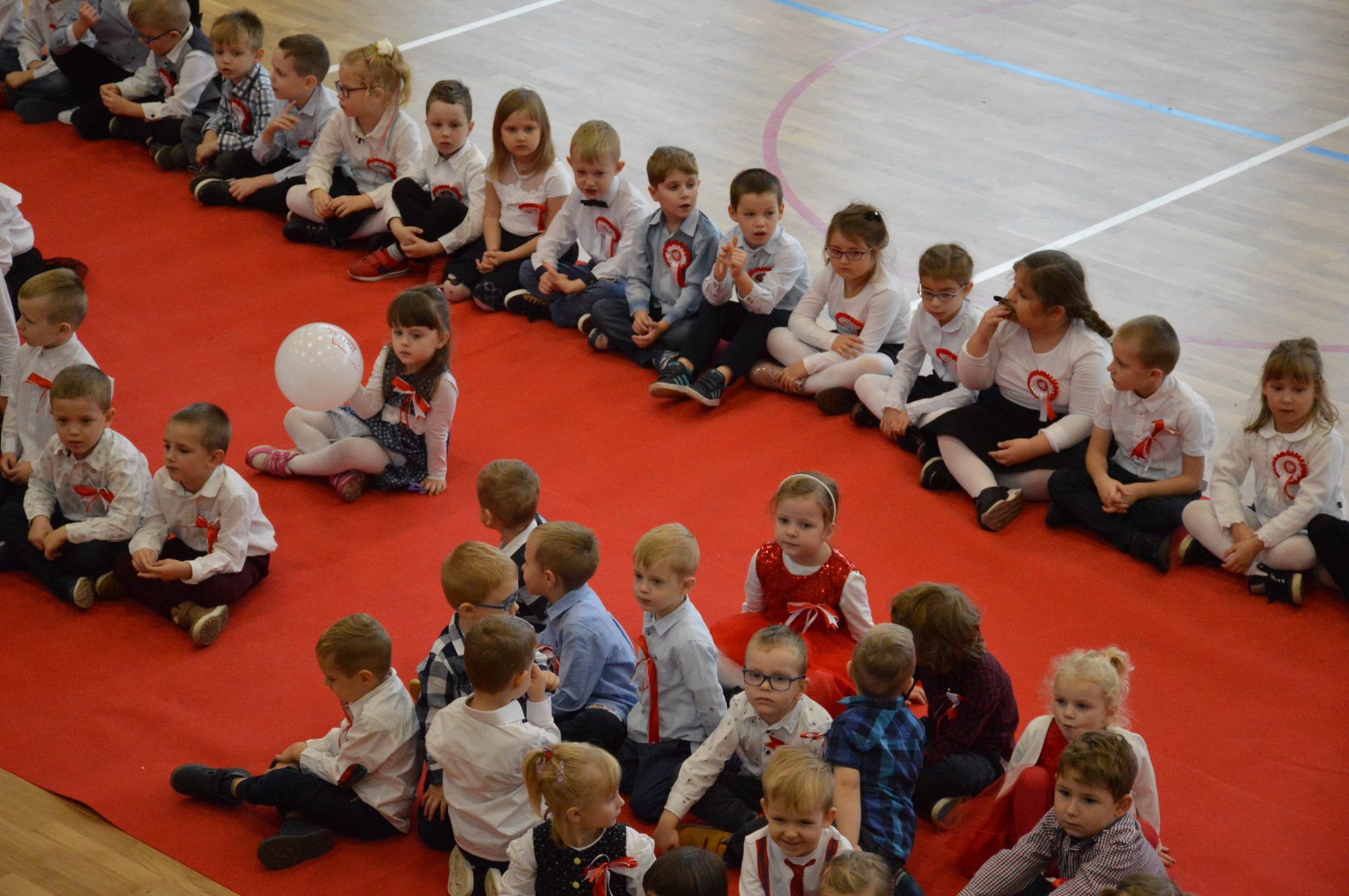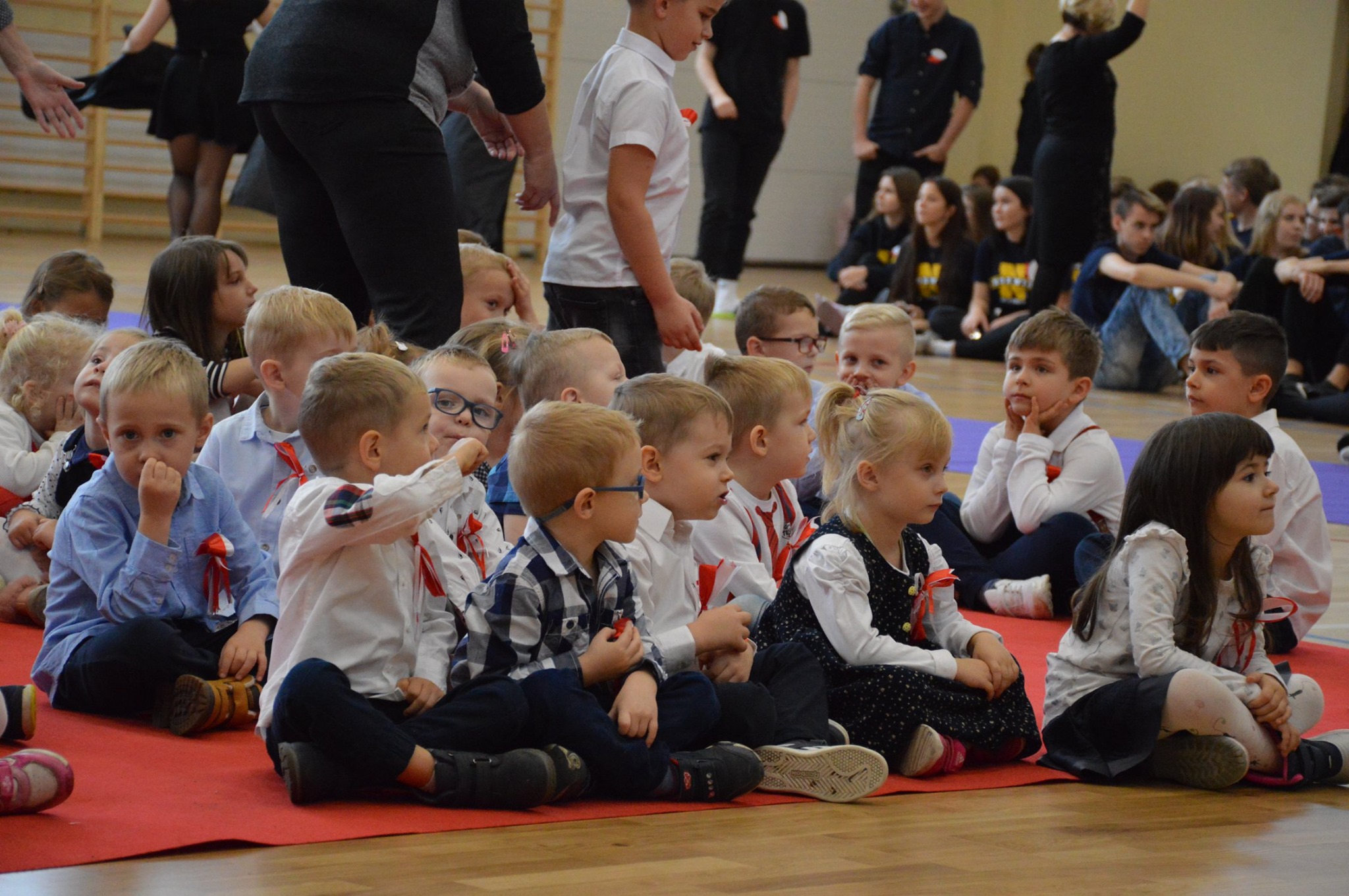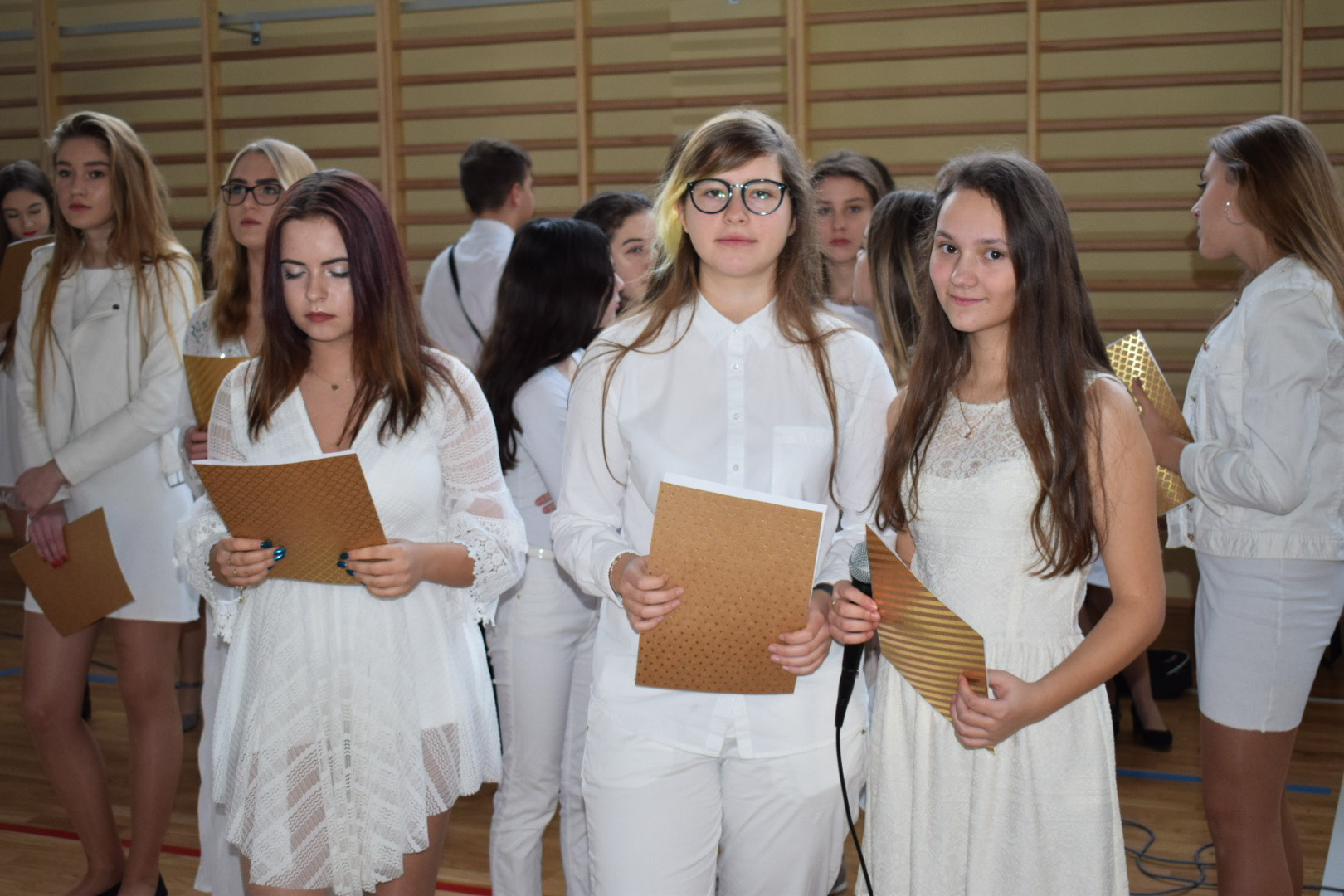 Osobno, z nauczycielami wychowania fizycznego, ćwiczyli swoje wejście nasi sportowcy. W jednym miejscu i czasie należało zmieścić i zgrać zawodników uprawiających różne dyscypliny: siatkówkę, piłkę ręczną i nożną, koszykówkę, akrobatki oraz dziewczęta przygotowujące pokaz ze wstążkami. Nawet dekoracja, w całości przygotowana przez J. Kopycińską, miała swoje próby rozmiaru, wytrzymałości i stabilności.