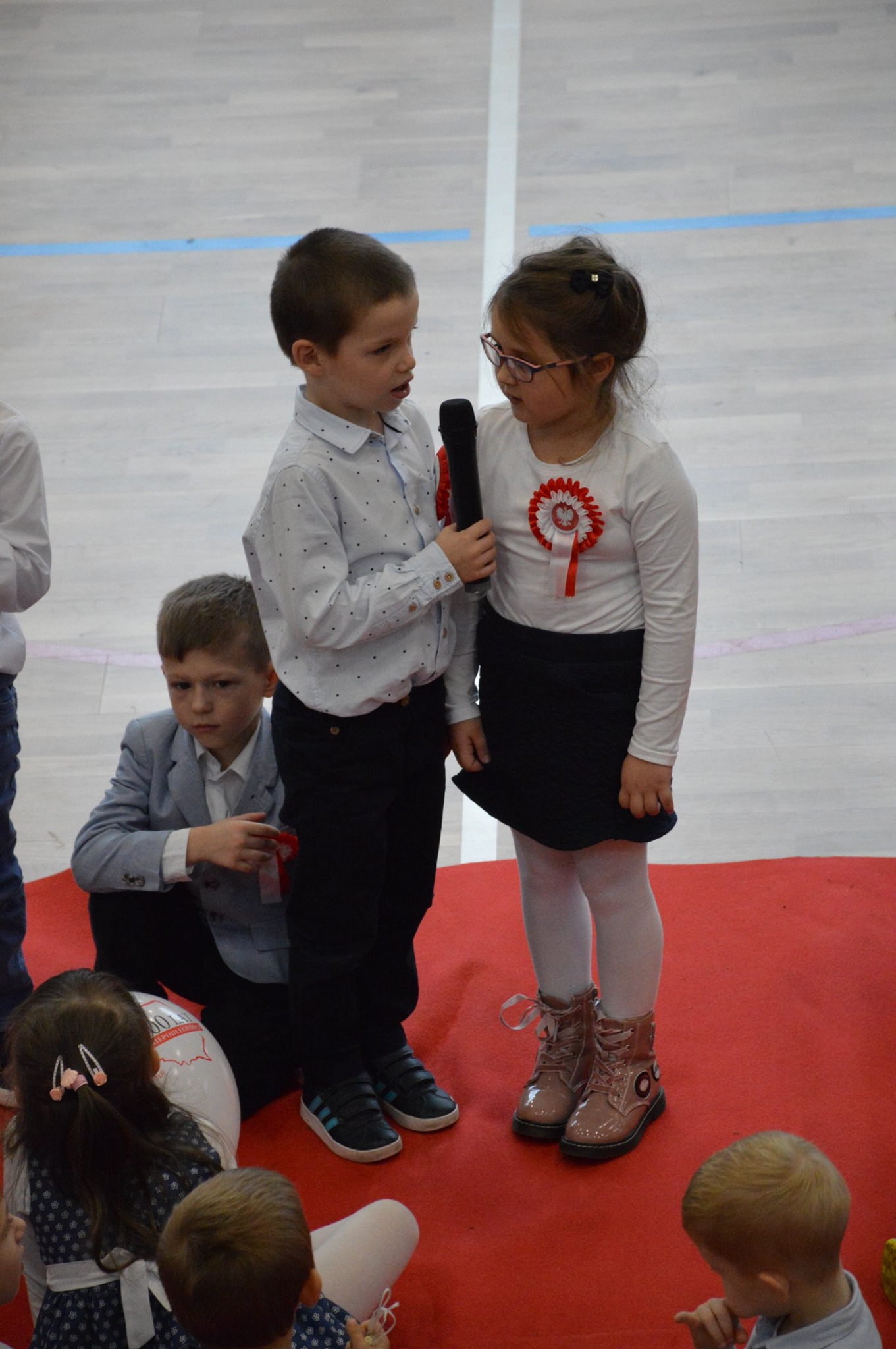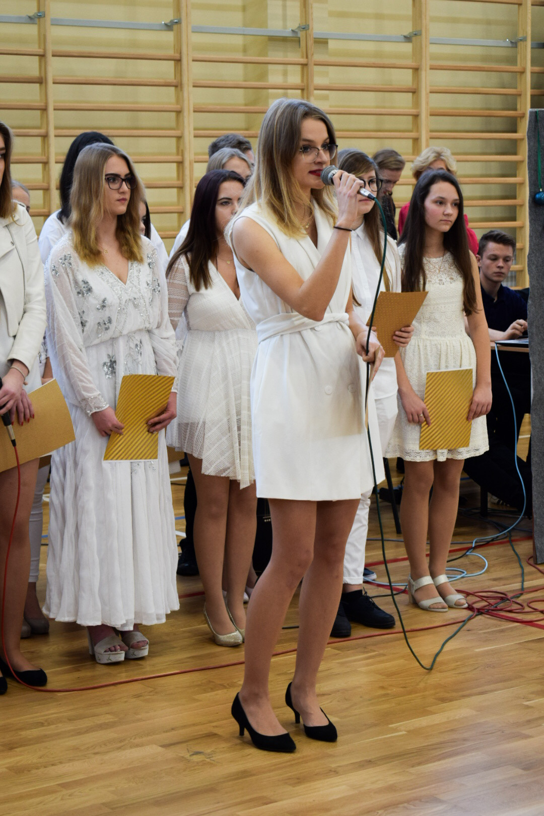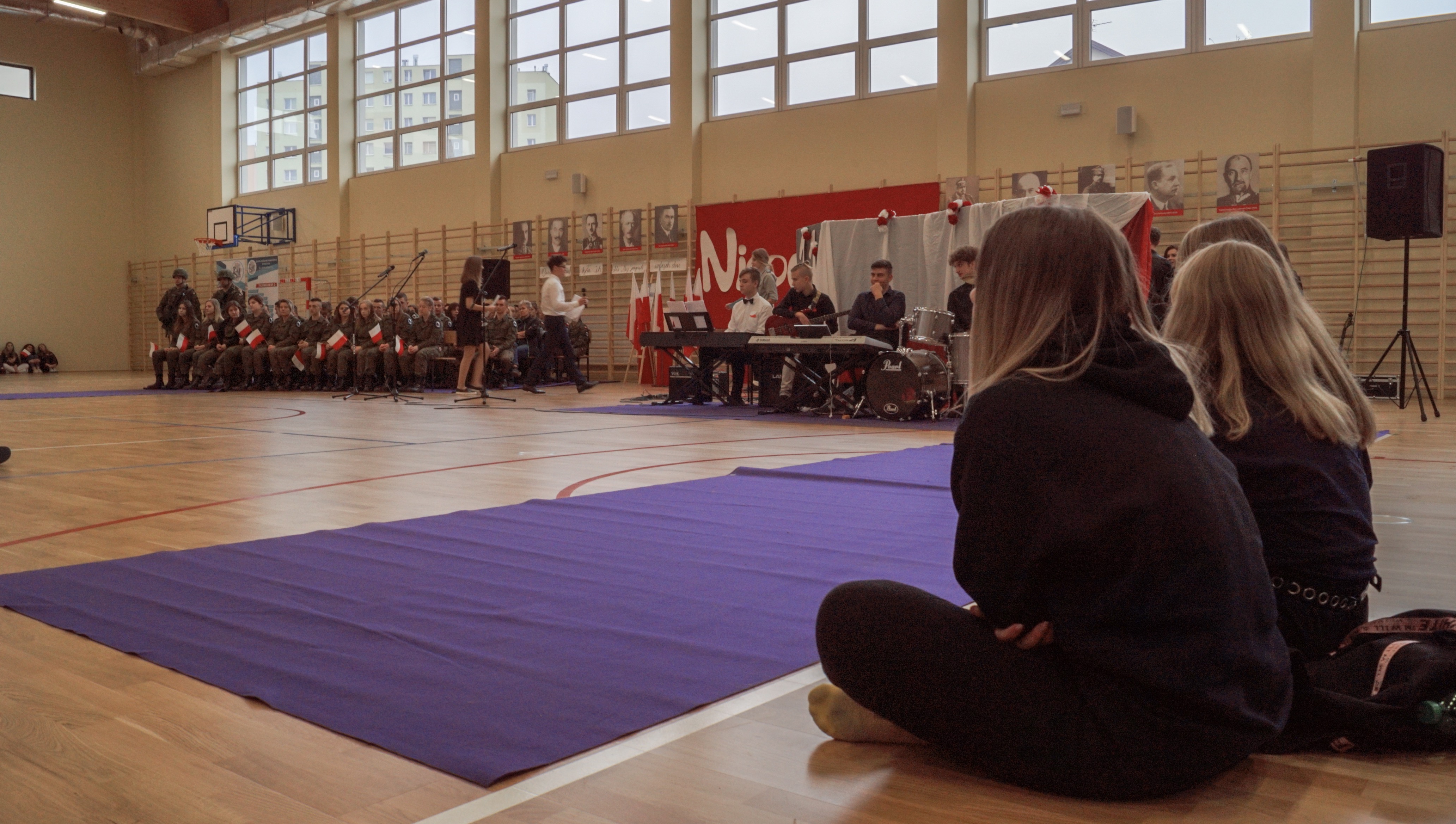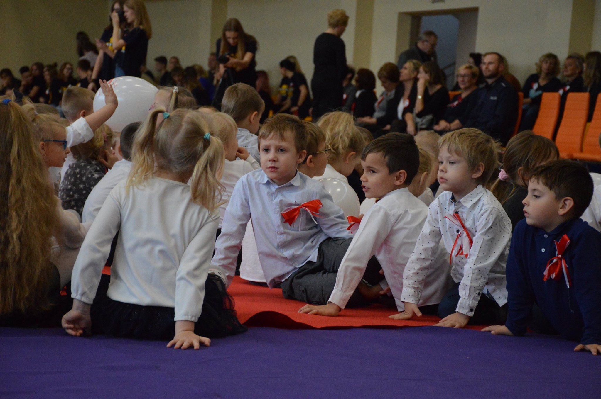 Osobno, z nauczycielami wychowania fizycznego, ćwiczyli swoje wejście nasi sportowcy. W jednym miejscu i czasie należało zmieścić i zgrać zawodników uprawiających różne dyscypliny: siatkówkę, piłkę ręczną i nożną, koszykówkę, akrobatki oraz dziewczęta przygotowujące pokaz ze wstążkami. Nawet dekoracja, w całości przygotowana przez J. Kopycińską, miała swoje próby rozmiaru, wytrzymałości i stabilności.