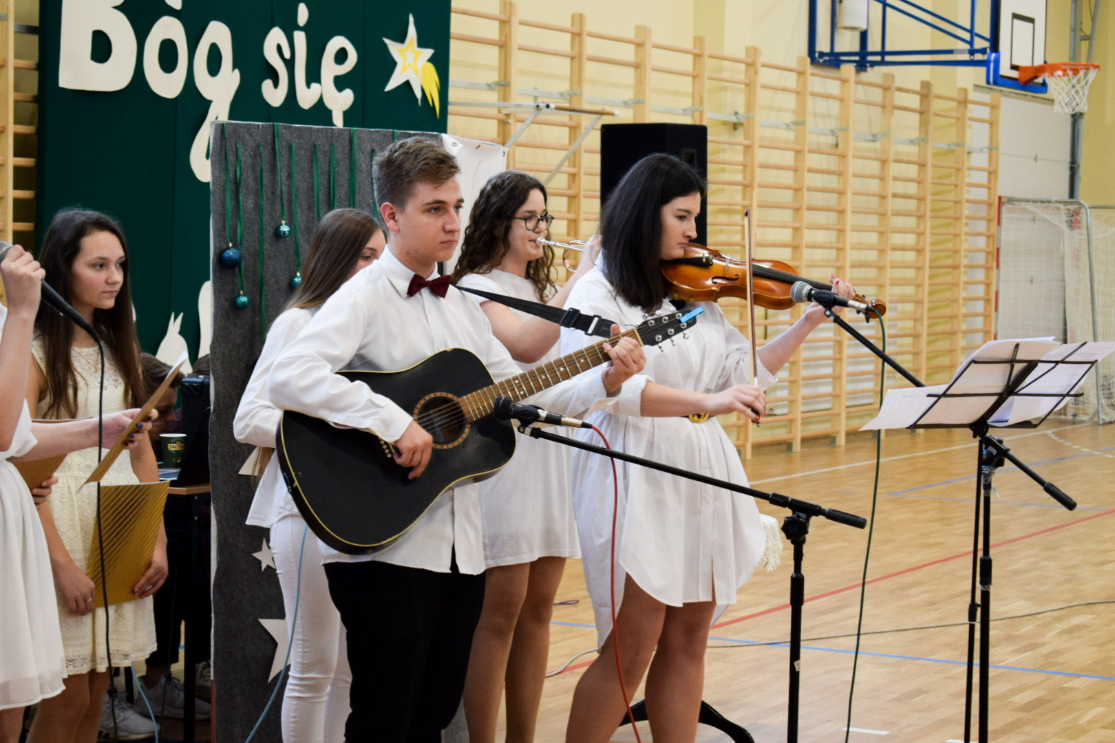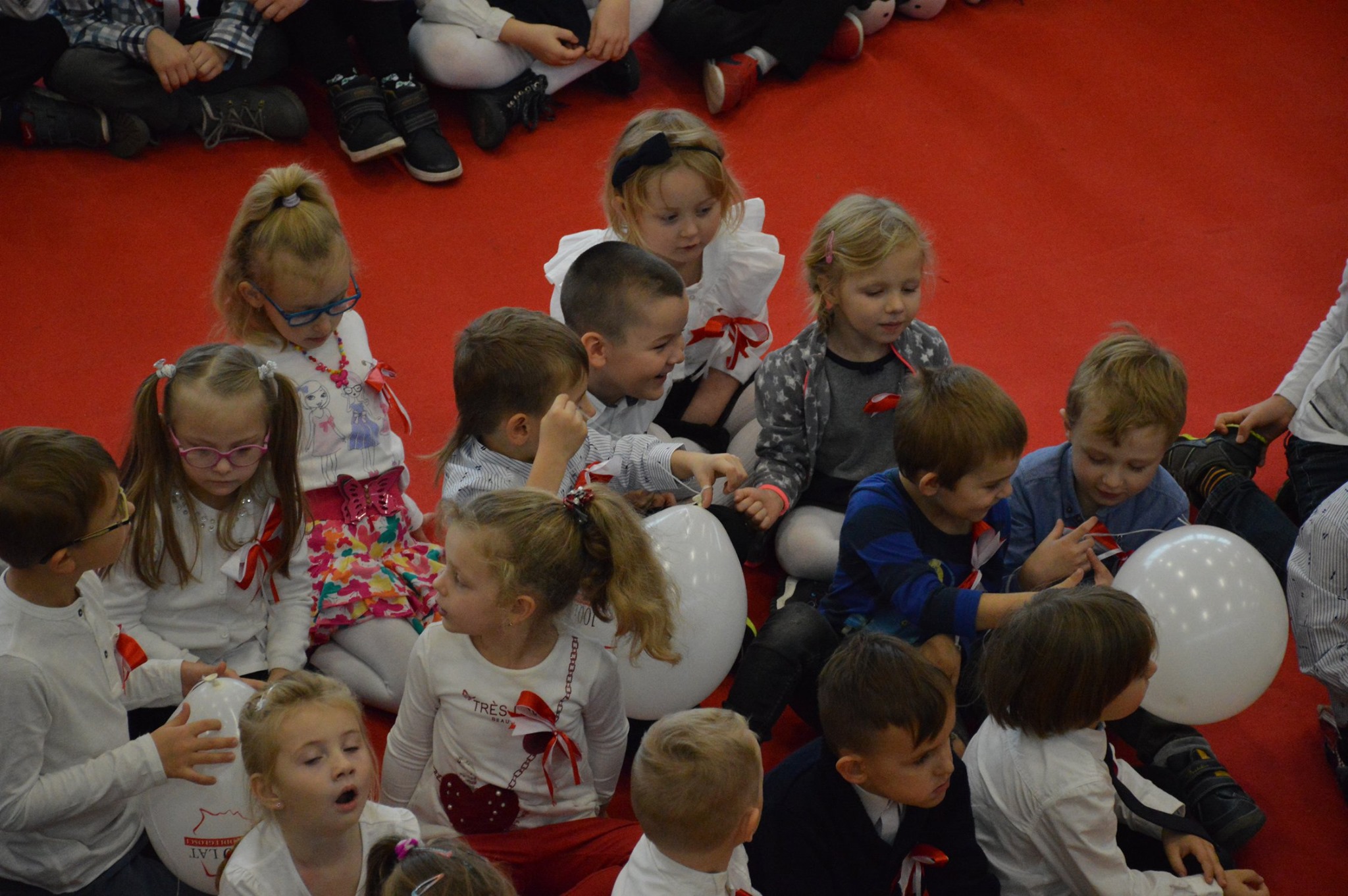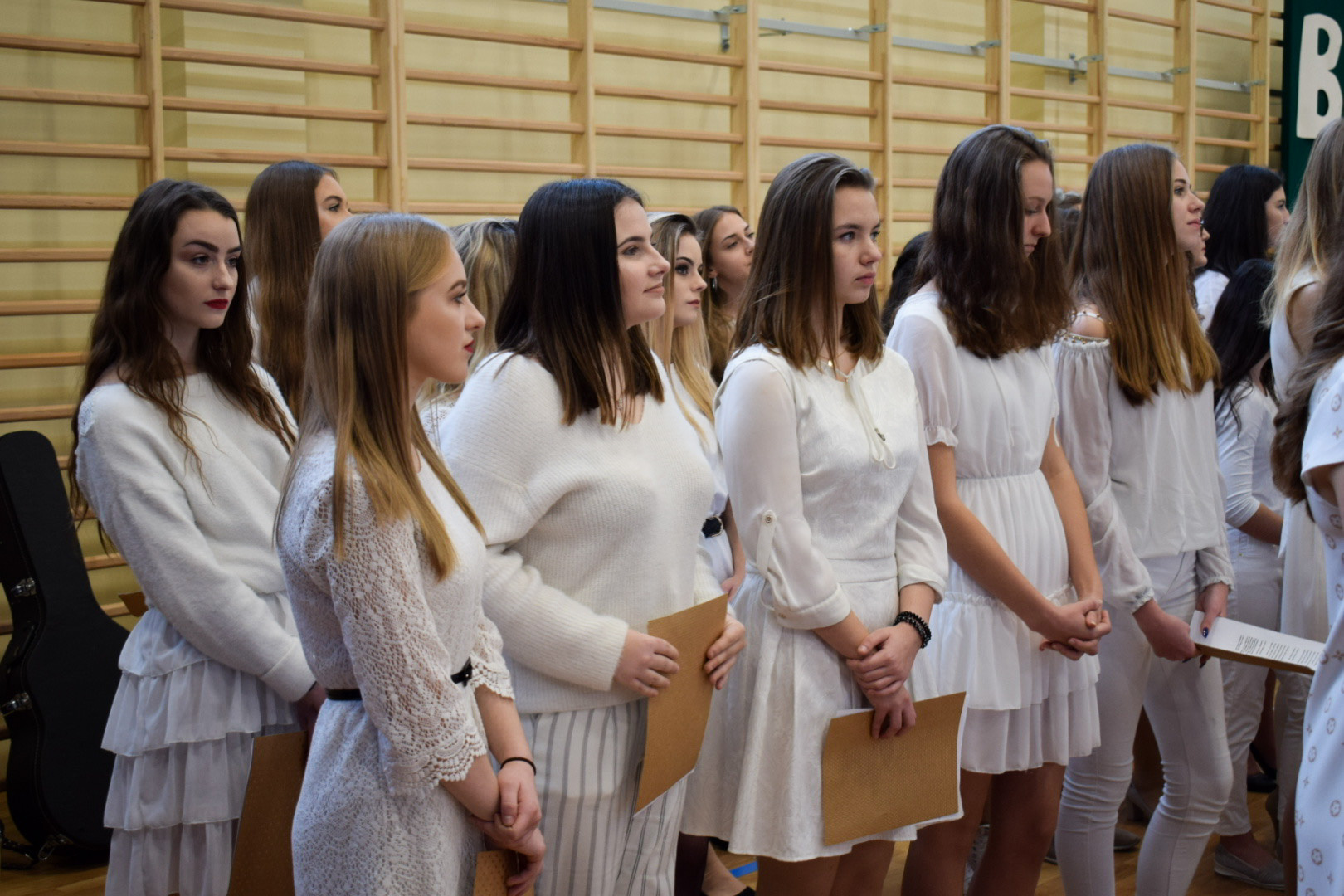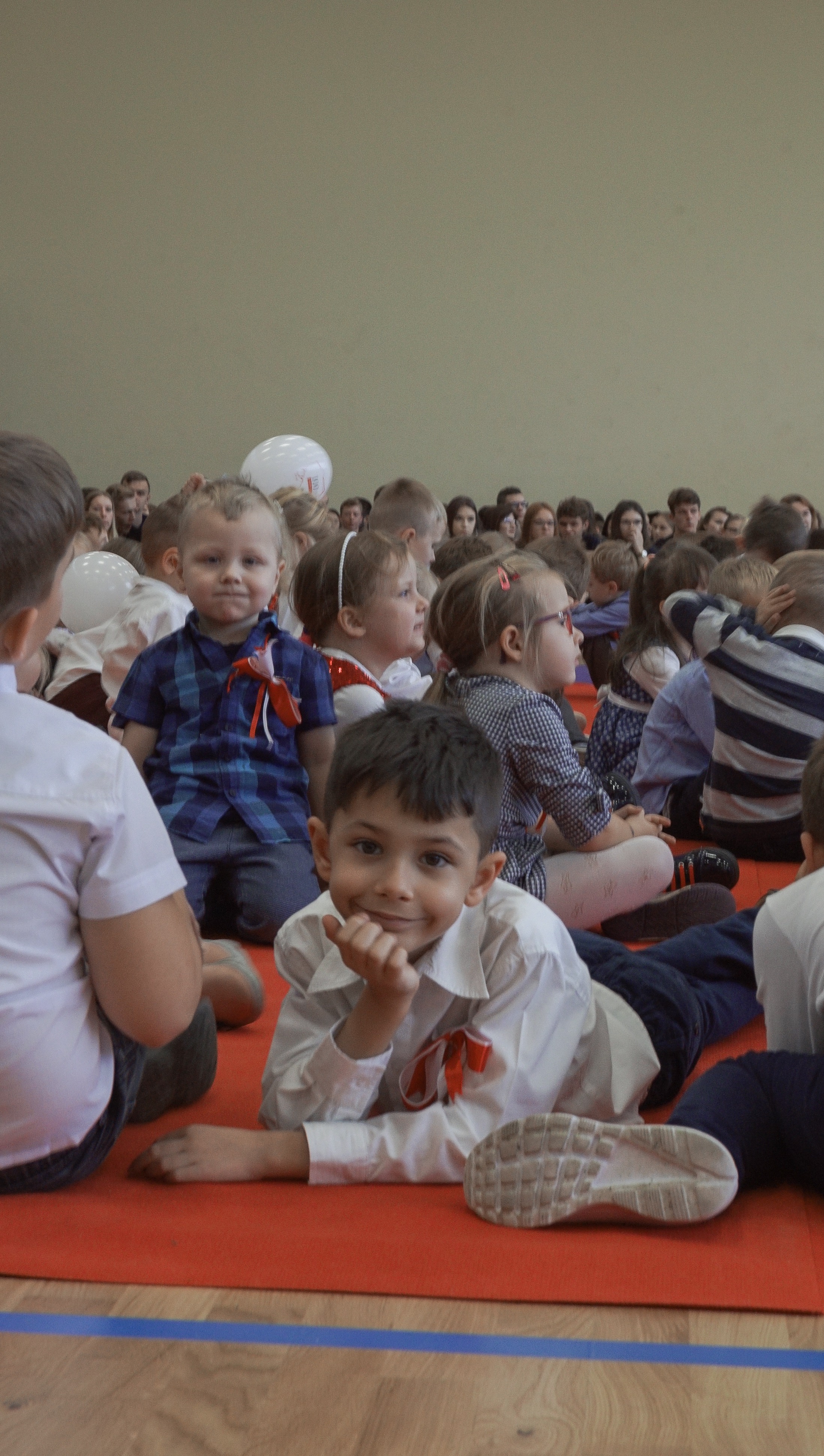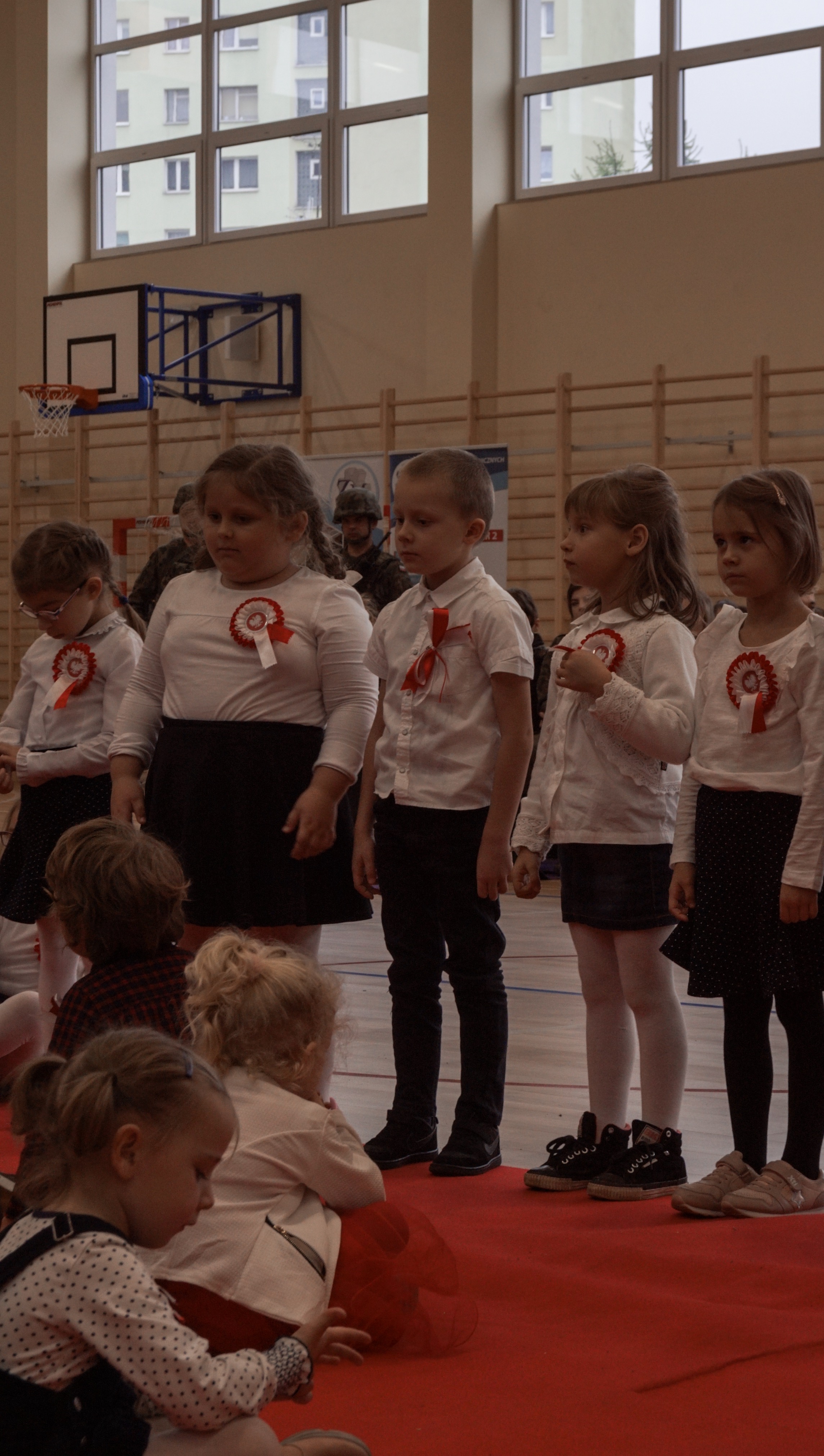 Osobno, z nauczycielami wychowania fizycznego, ćwiczyli swoje wejście nasi sportowcy. W jednym miejscu i czasie należało zmieścić i zgrać zawodników uprawiających różne dyscypliny: siatkówkę, piłkę ręczną i nożną, koszykówkę, akrobatki oraz dziewczęta przygotowujące pokaz ze wstążkami. Nawet dekoracja, w całości przygotowana przez J. Kopycińską, miała swoje próby rozmiaru, wytrzymałości i stabilności.