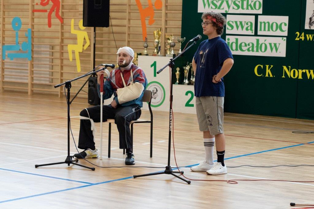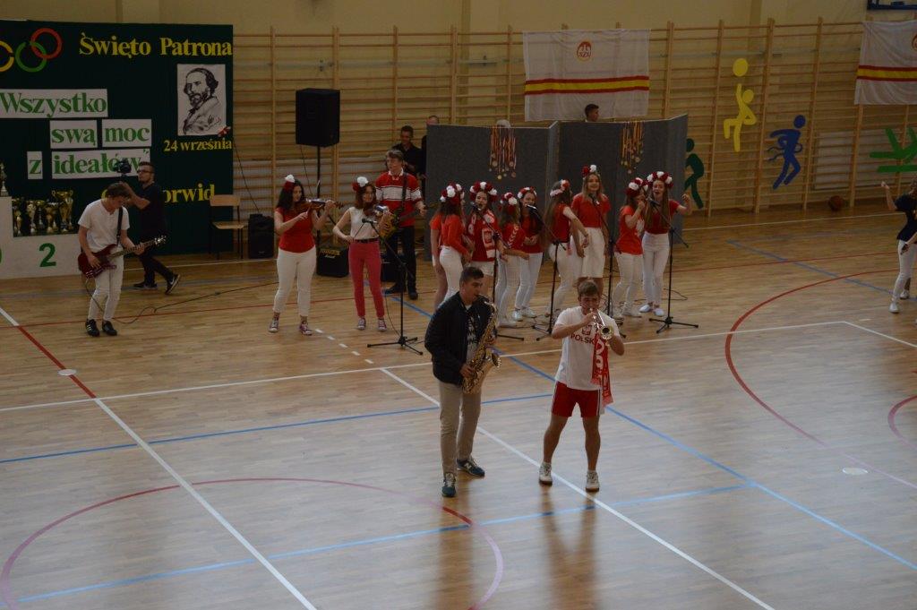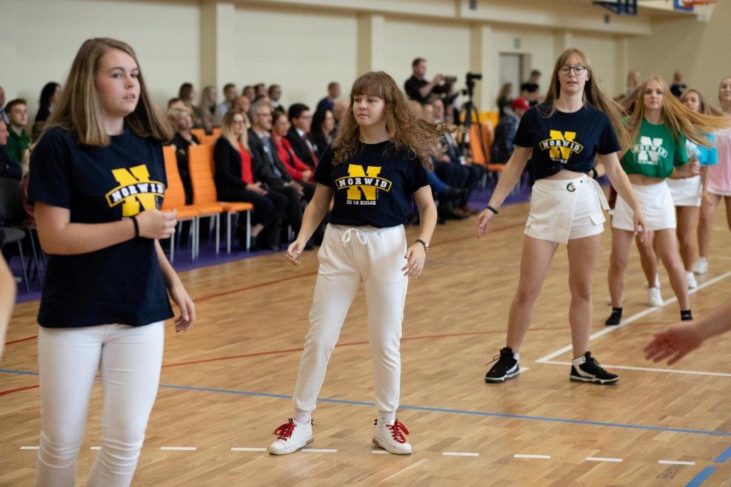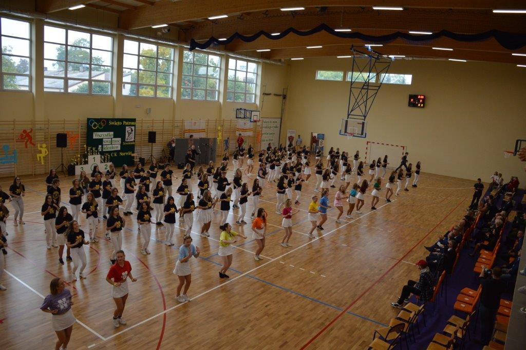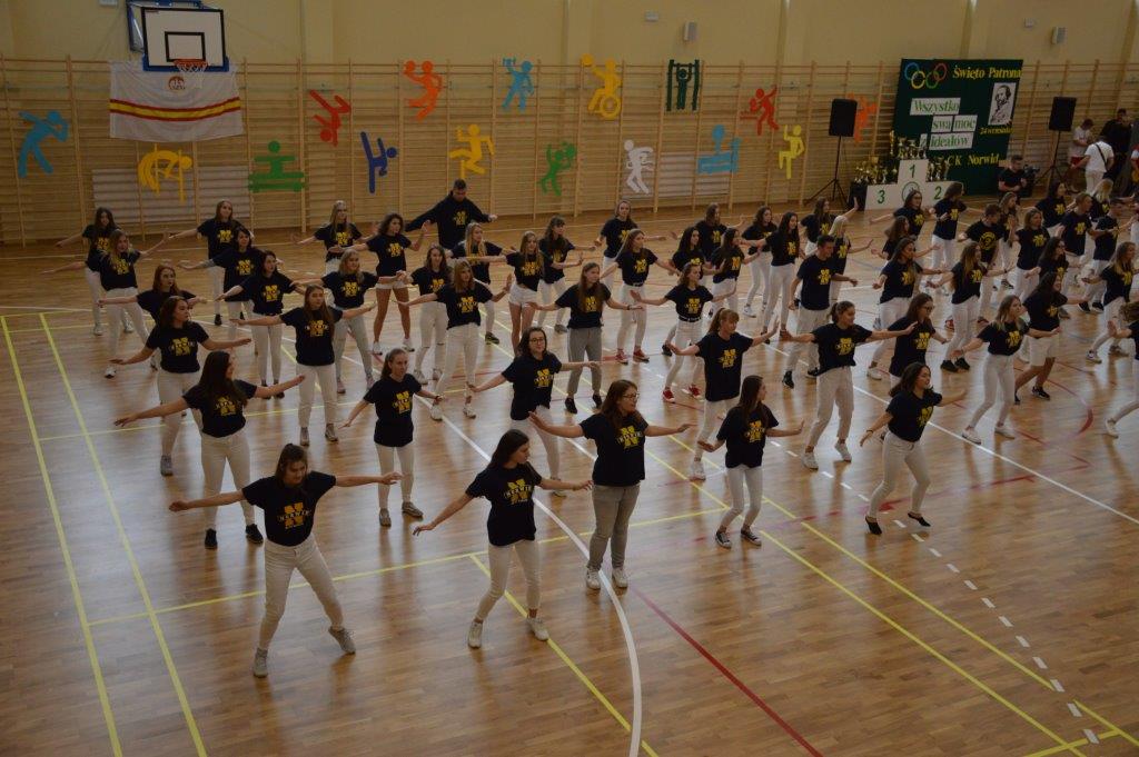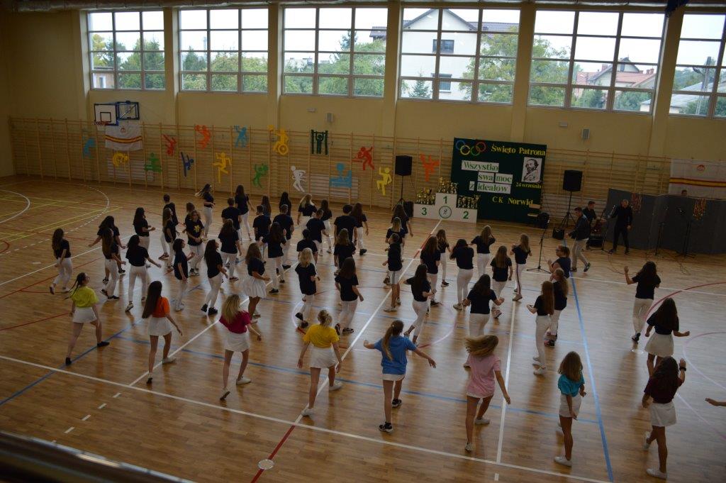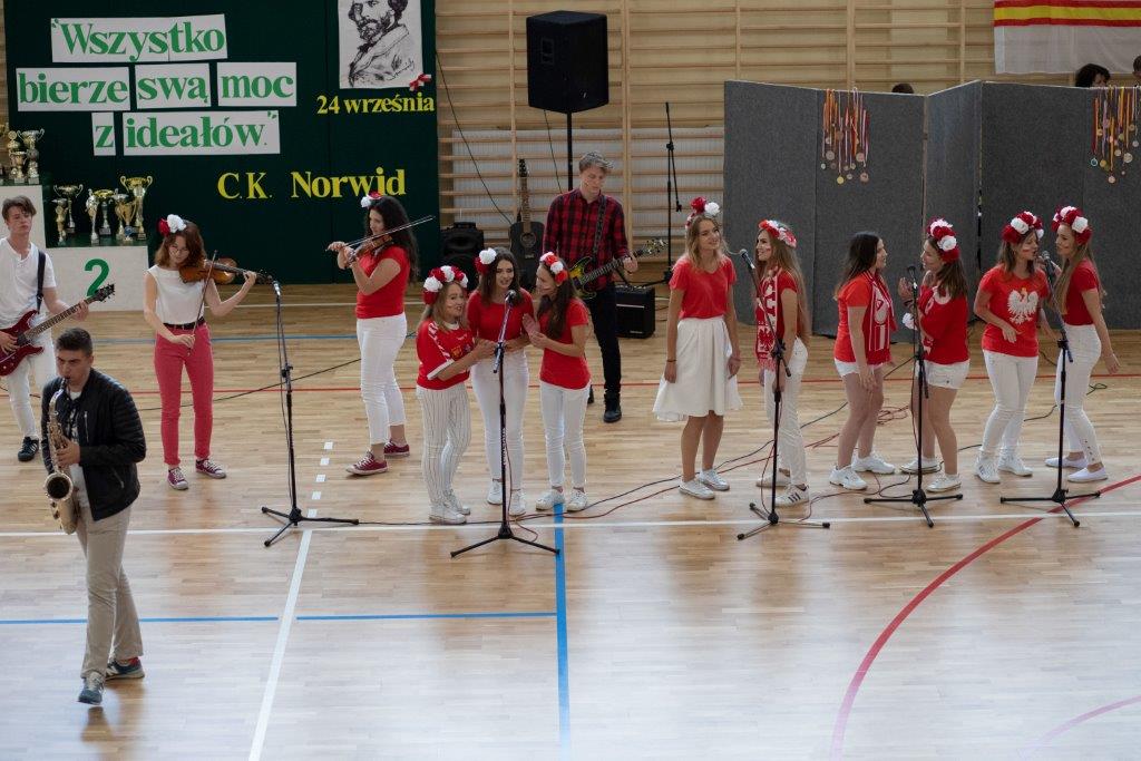 W części artystyczno – sportowej, przygotowanej według scenariusza p. Justyny Kopycińskiej, wystąpili uczniowie klas drugich i trzecich. Mogliśmy podziwiać kilka zróżnicowanych pod względem charakteru tańców, w wykonaniu naszych uzdolnionych uczennic. Usłyszeliśmy piosenki w wykonaniu połączonych sił uczennic i absolwentek, którym towarzyszyli na instrumentach dętych i strunowych koledzy i koleżanki ze szkolnych ław. „Oda do sportu” w wykonaniu Westalek z kl. 2 „f” oraz ceremonia przecięcia wstęgi, nadały uroczystości podniosły charakter. Każdemu z elementów występu towarzyszyły odpowiednie fragmenty muzyczne, również części, w której prezentowali się sportowcy. Nie brakło akcentów humorystycznych. Grupa „No Stress” (kierowana przez p. Krzysztofa Arendarskiego), wzmocniona doświadczonymi absolwenckimi talentami aktorskimi, przedstawiła zabawny skecz o uprawianiu sportów ekstremalnych. Finałem był wspólny „spontaniczny” Flashmob ponad 200 uczniów oraz wspólnie przez wszystkich wykonana piosenka – „Norwid gra” (tekst poniżej).