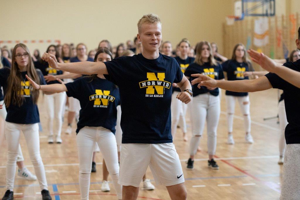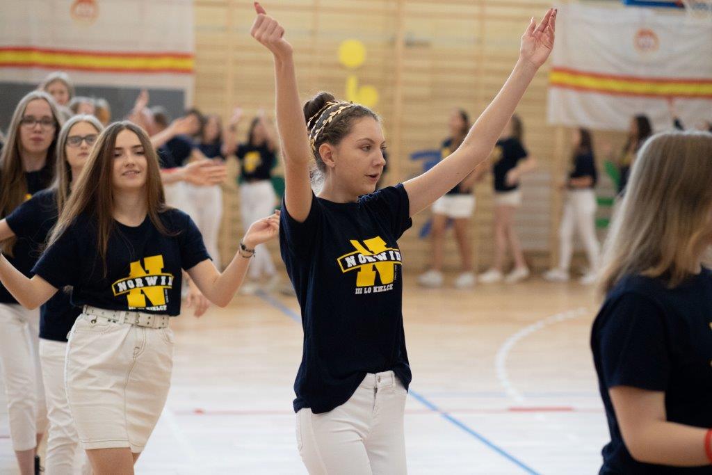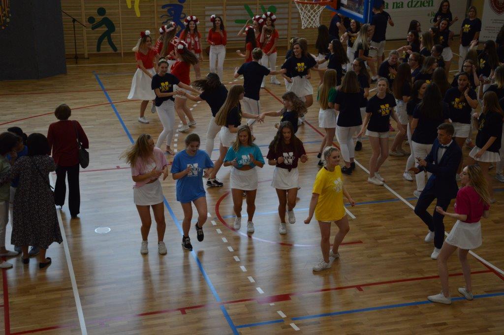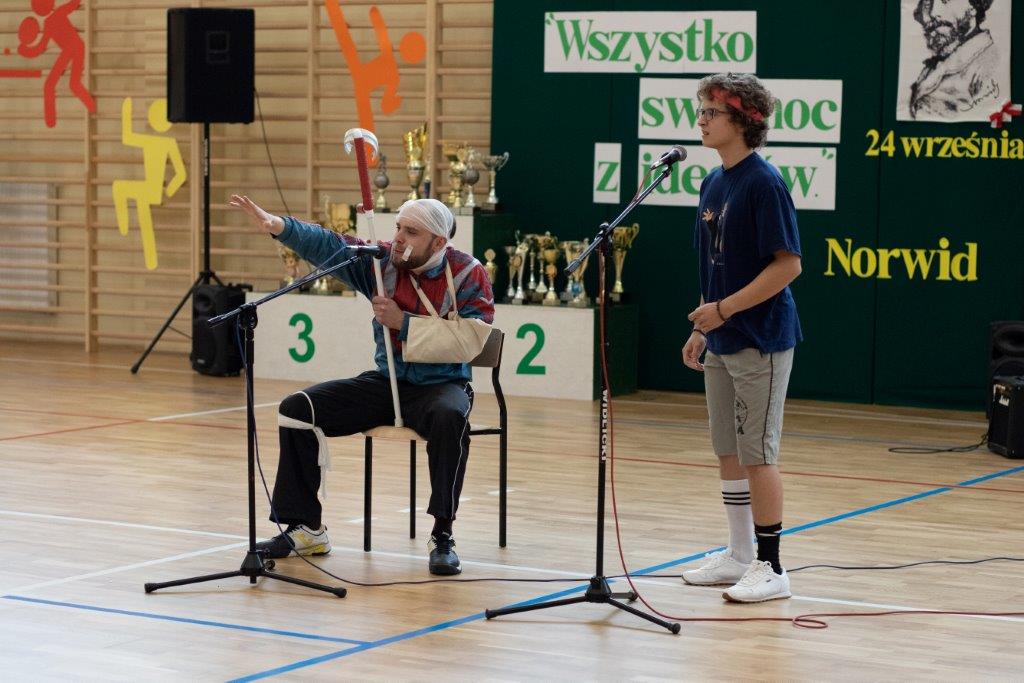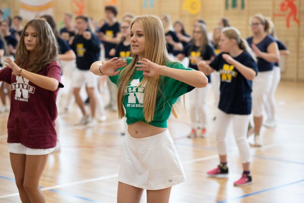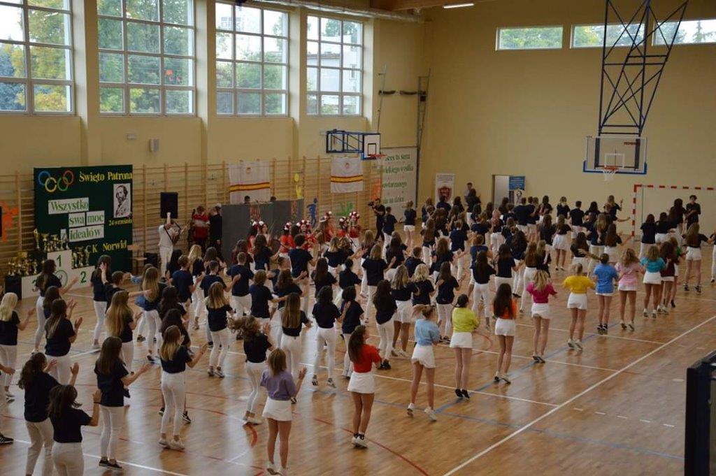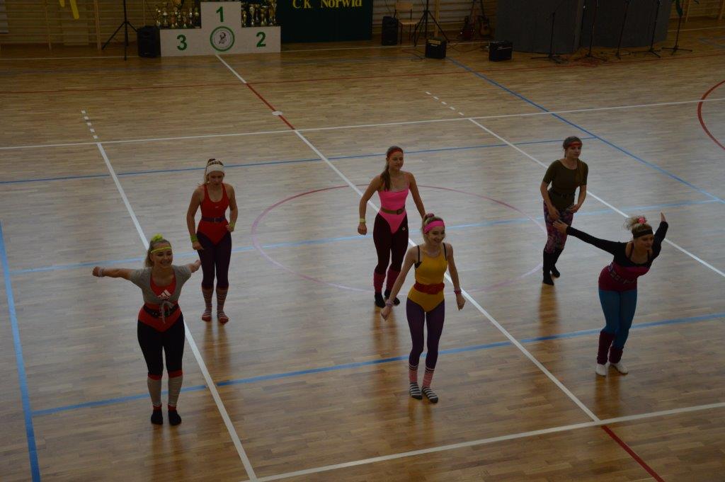 W części artystyczno – sportowej, przygotowanej według scenariusza p. Justyny Kopycińskiej, wystąpili uczniowie klas drugich i trzecich. Mogliśmy podziwiać kilka zróżnicowanych pod względem charakteru tańców, w wykonaniu naszych uzdolnionych uczennic. Usłyszeliśmy piosenki w wykonaniu połączonych sił uczennic i absolwentek, którym towarzyszyli na instrumentach dętych i strunowych koledzy i koleżanki ze szkolnych ław. „Oda do sportu” w wykonaniu Westalek z kl. 2 „f” oraz ceremonia przecięcia wstęgi, nadały uroczystości podniosły charakter. Każdemu z elementów występu towarzyszyły odpowiednie fragmenty muzyczne, również części, w której prezentowali się sportowcy. Nie brakło akcentów humorystycznych. Grupa „No Stress” (kierowana przez p. Krzysztofa Arendarskiego), wzmocniona doświadczonymi absolwenckimi talentami aktorskimi, przedstawiła zabawny skecz o uprawianiu sportów ekstremalnych. Finałem był wspólny „spontaniczny” Flashmob ponad 200 uczniów oraz wspólnie przez wszystkich wykonana piosenka – „Norwid gra” (tekst poniżej).