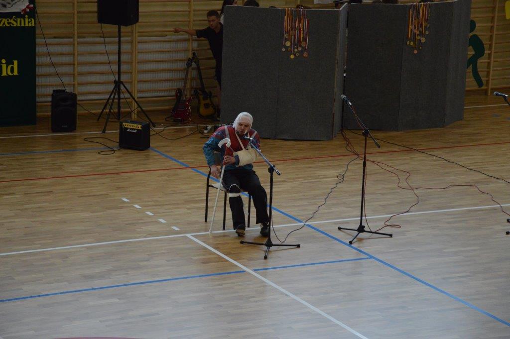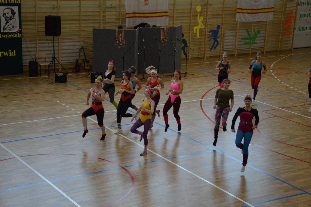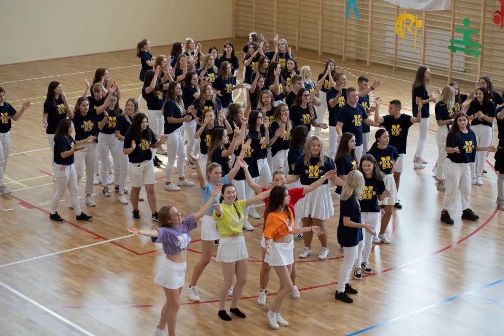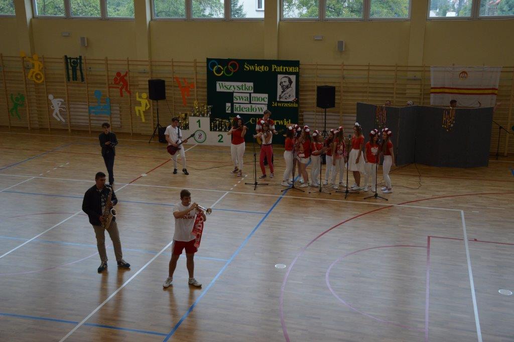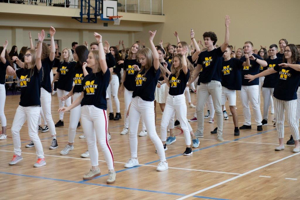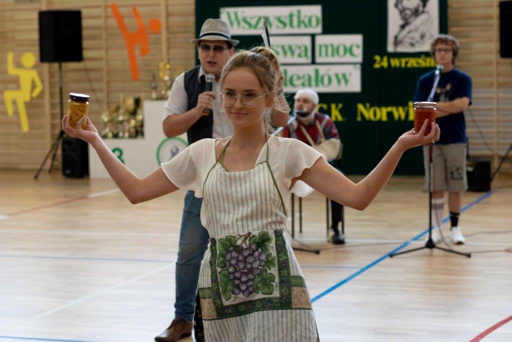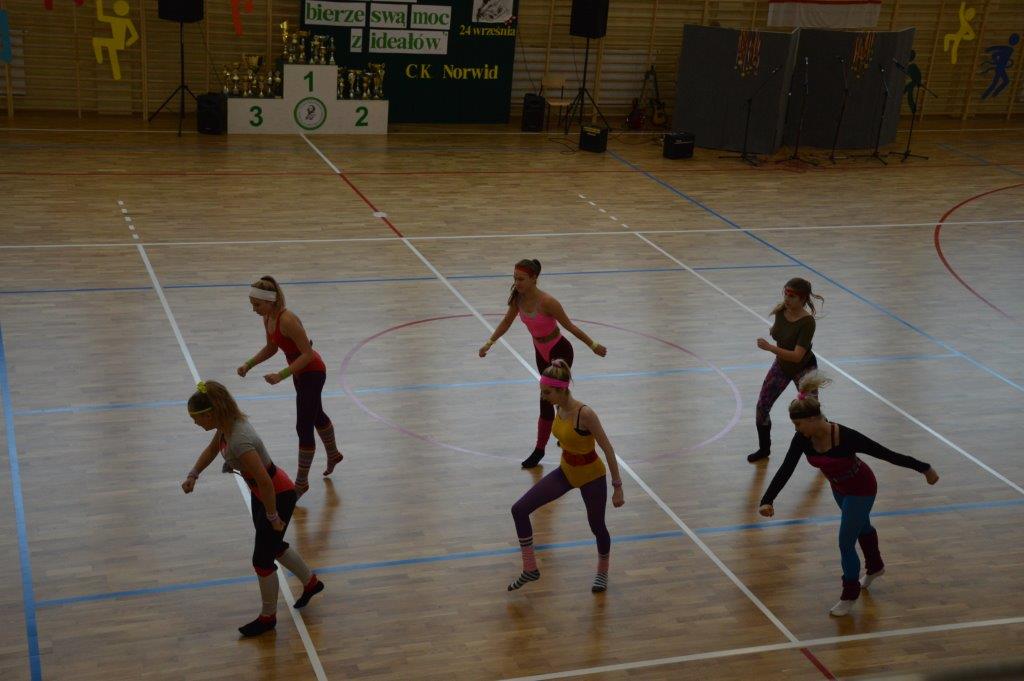 W części artystyczno – sportowej, przygotowanej według scenariusza p. Justyny Kopycińskiej, wystąpili uczniowie klas drugich i trzecich. Mogliśmy podziwiać kilka zróżnicowanych pod względem charakteru tańców, w wykonaniu naszych uzdolnionych uczennic. Usłyszeliśmy piosenki w wykonaniu połączonych sił uczennic i absolwentek, którym towarzyszyli na instrumentach dętych i strunowych koledzy i koleżanki ze szkolnych ław. „Oda do sportu” w wykonaniu Westalek z kl. 2 „f” oraz ceremonia przecięcia wstęgi, nadały uroczystości podniosły charakter. Każdemu z elementów występu towarzyszyły odpowiednie fragmenty muzyczne, również części, w której prezentowali się sportowcy. Nie brakło akcentów humorystycznych. Grupa „No Stress” (kierowana przez p. Krzysztofa Arendarskiego), wzmocniona doświadczonymi absolwenckimi talentami aktorskimi, przedstawiła zabawny skecz o uprawianiu sportów ekstremalnych. Finałem był wspólny „spontaniczny” Flashmob ponad 200 uczniów oraz wspólnie przez wszystkich wykonana piosenka – „Norwid gra” (tekst poniżej).