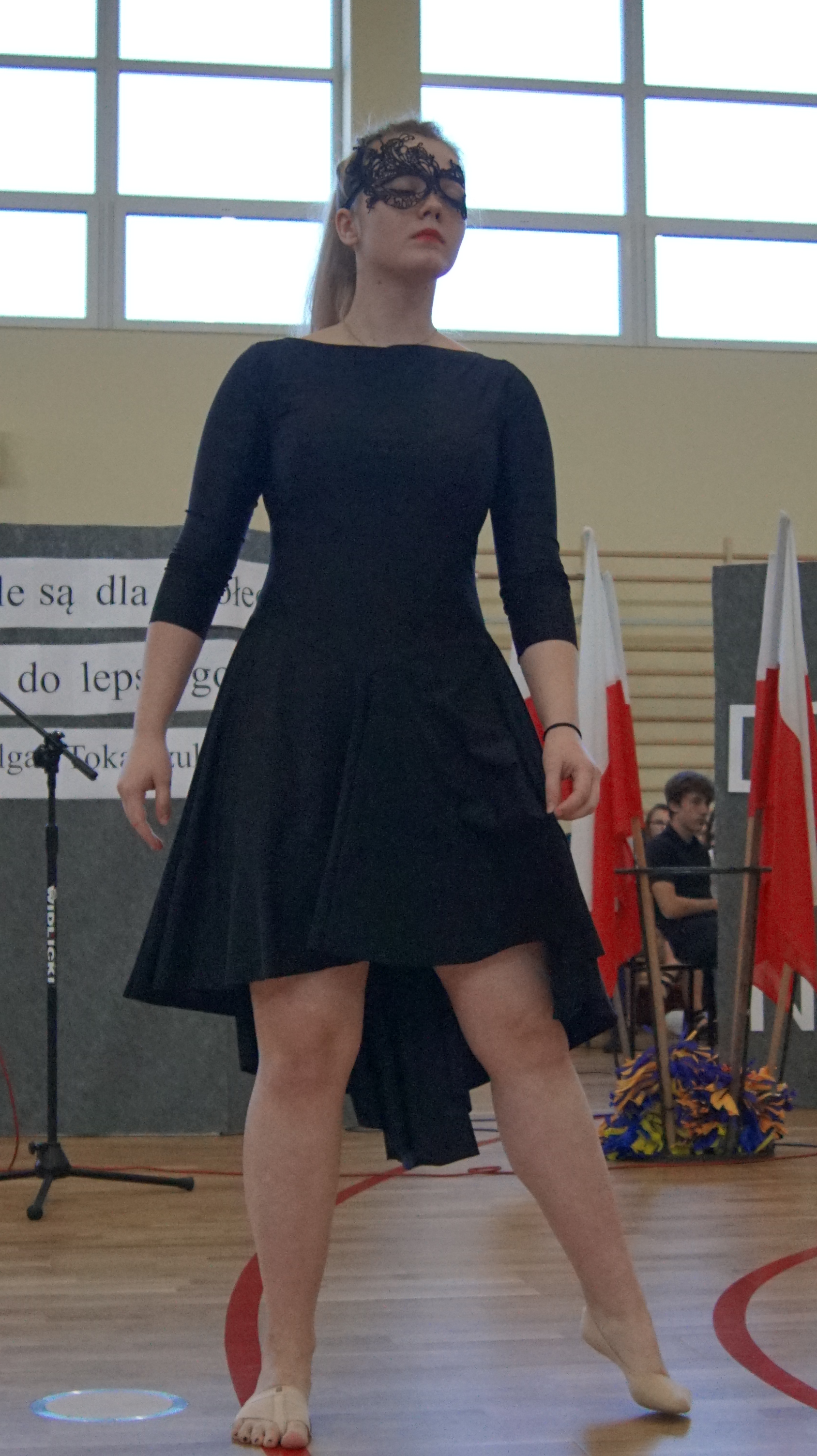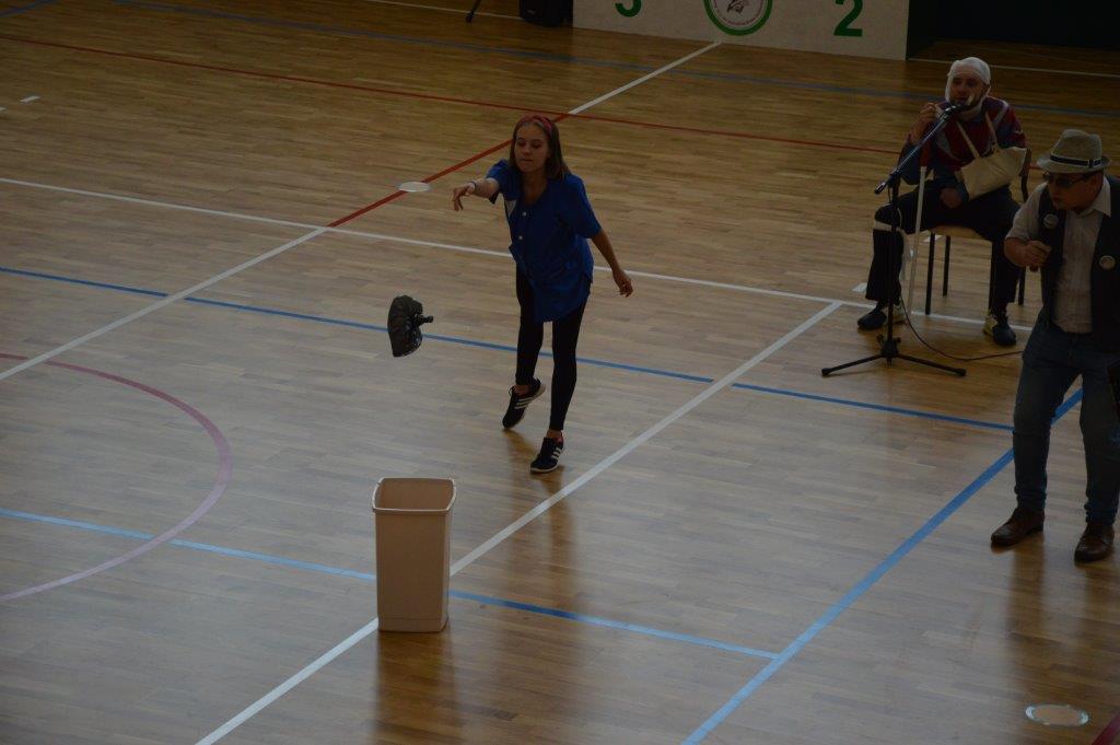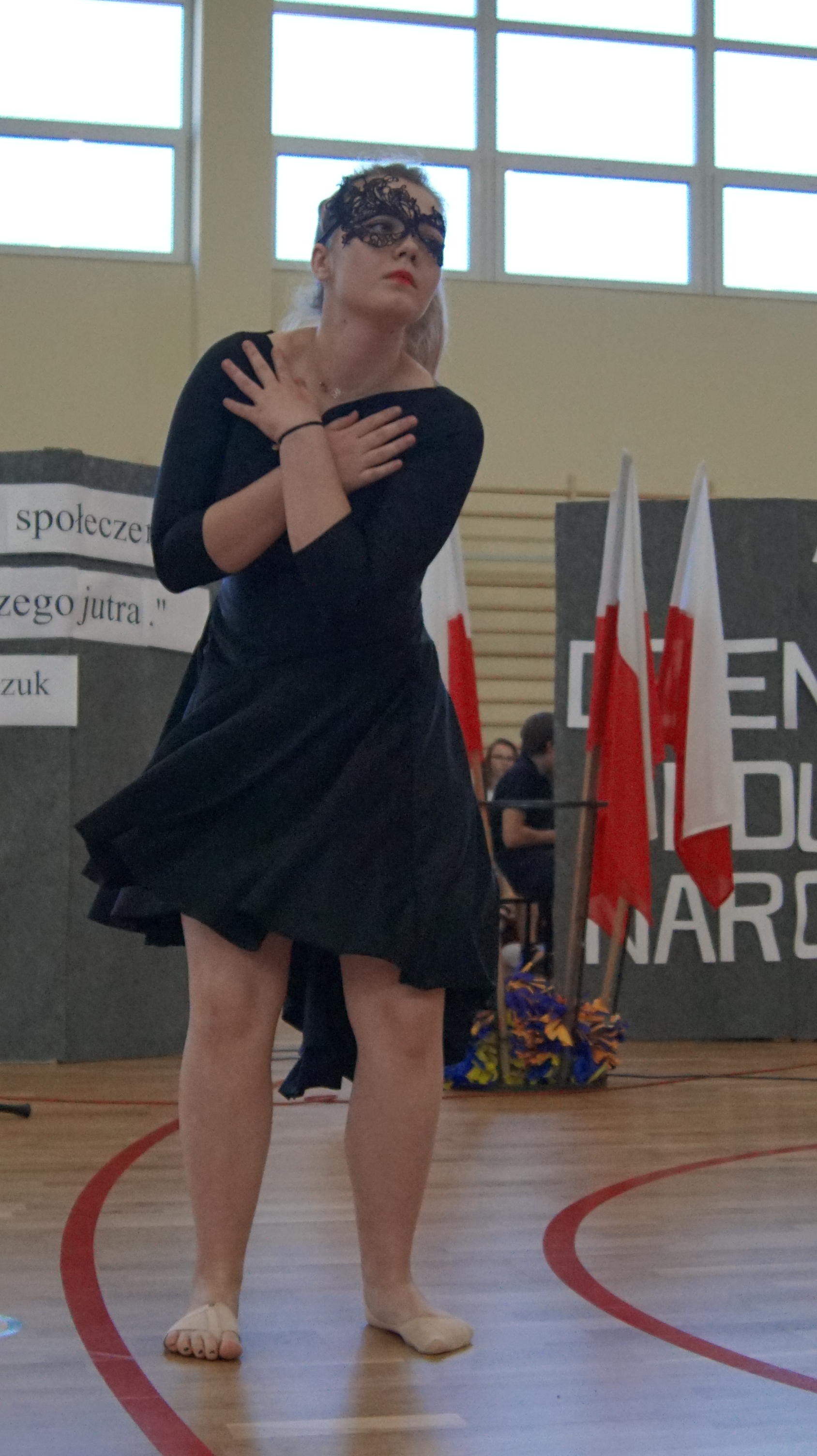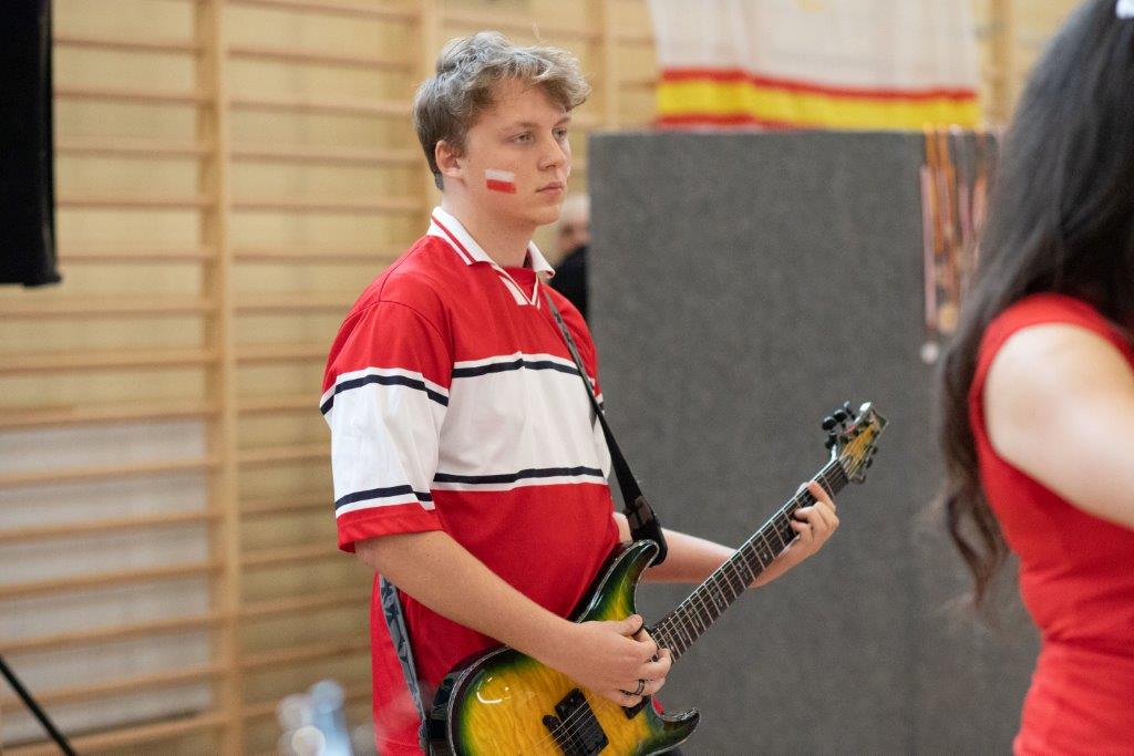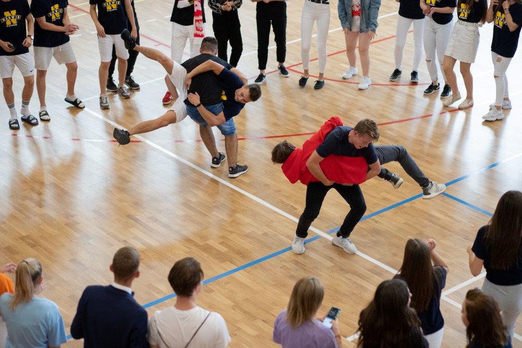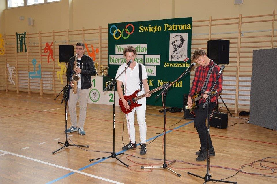 W części artystyczno – sportowej, przygotowanej według scenariusza p. Justyny Kopycińskiej, wystąpili uczniowie klas drugich i trzecich. Mogliśmy podziwiać kilka zróżnicowanych pod względem charakteru tańców, w wykonaniu naszych uzdolnionych uczennic. Usłyszeliśmy piosenki w wykonaniu połączonych sił uczennic i absolwentek, którym towarzyszyli na instrumentach dętych i strunowych koledzy i koleżanki ze szkolnych ław. „Oda do sportu” w wykonaniu Westalek z kl. 2 „f” oraz ceremonia przecięcia wstęgi, nadały uroczystości podniosły charakter. Każdemu z elementów występu towarzyszyły odpowiednie fragmenty muzyczne, również części, w której prezentowali się sportowcy. Nie brakło akcentów humorystycznych. Grupa „No Stress” (kierowana przez p. Krzysztofa Arendarskiego), wzmocniona doświadczonymi absolwenckimi talentami aktorskimi, przedstawiła zabawny skecz o uprawianiu sportów ekstremalnych. Finałem był wspólny „spontaniczny” Flashmob ponad 200 uczniów oraz wspólnie przez wszystkich wykonana piosenka – „Norwid gra” (tekst poniżej).