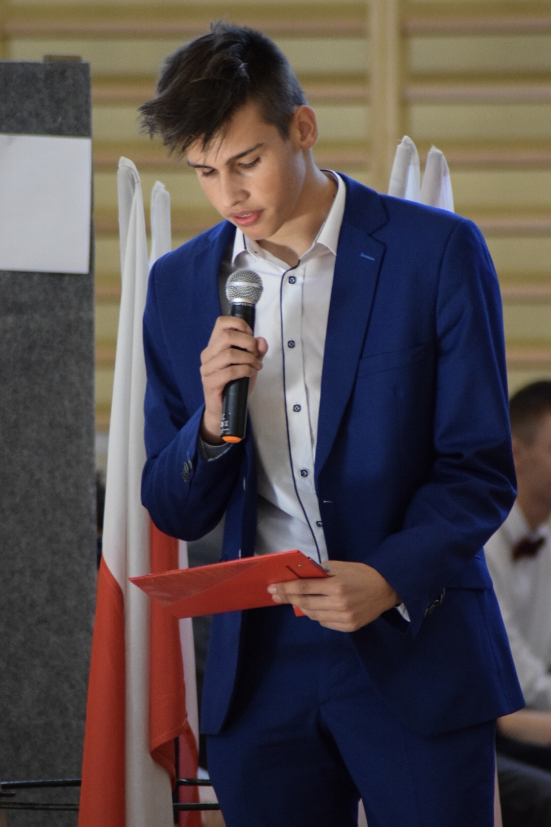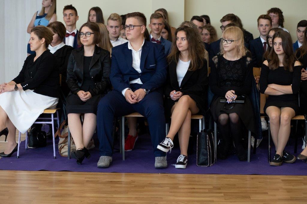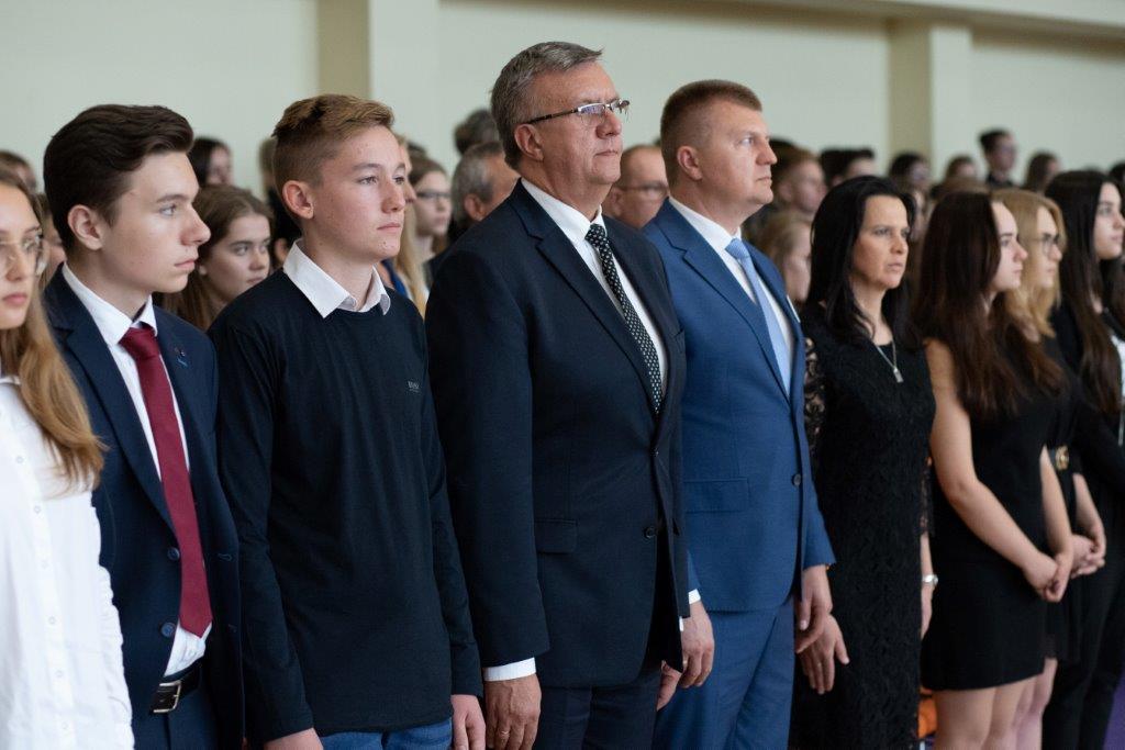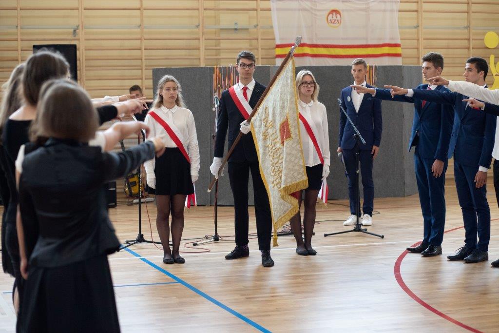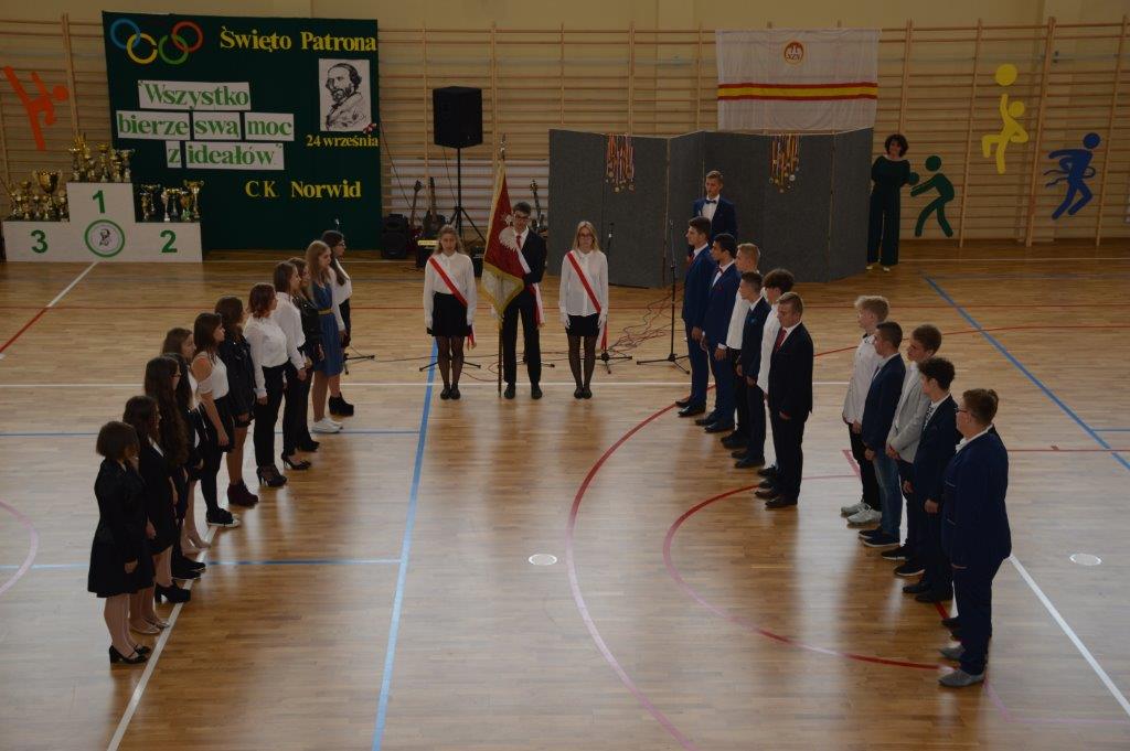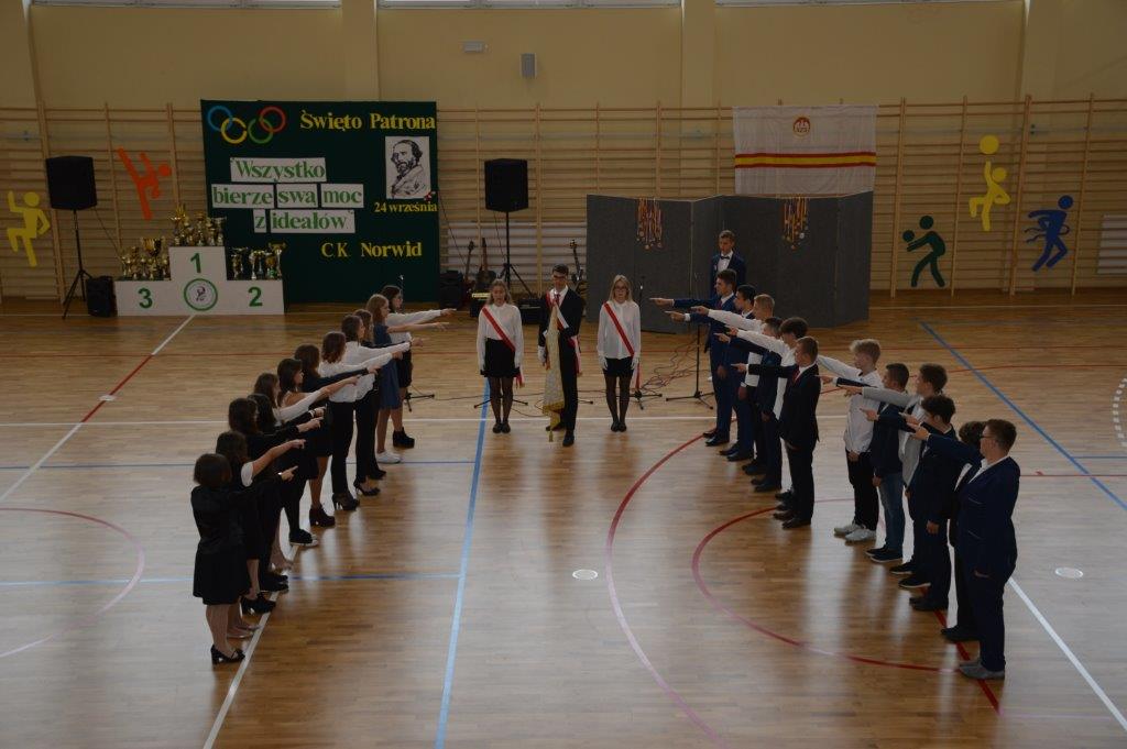 Właśnie pierwszoklasiści byli bohaterami kolejnej uroczystości – ŚLUBOWANIA, które odbyło się tego samego dnia o godzinie 13-stej. Ceremonię poprowadził p. Rafał Sękowski. W imieniu 12 klas pierwszych uroczyste ślubowanie składali ich przedstawiciele. Po wysłuchaniu skierowanych do nich słów Dyrektora Andrzeja Zdeba, obejrzeli program przygotowany na Otwarcie Hali, wzbogacony o elementy powiązane z życiem i twórczością naszego patrona. W tym dniu spotkali się też z wychowawcami, a stając się pełnoprawnymi członkami Norwidowskiej rodziny, otrzymali legitymacje szkolne.