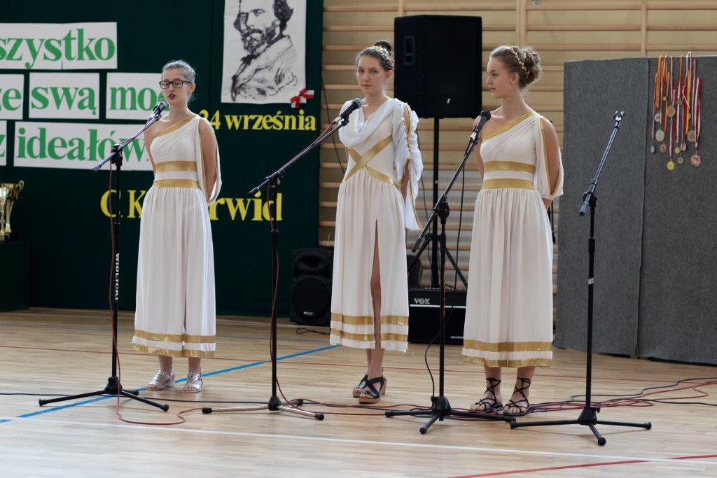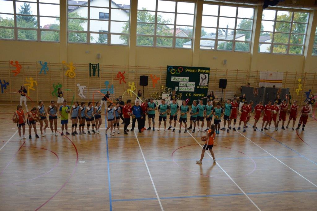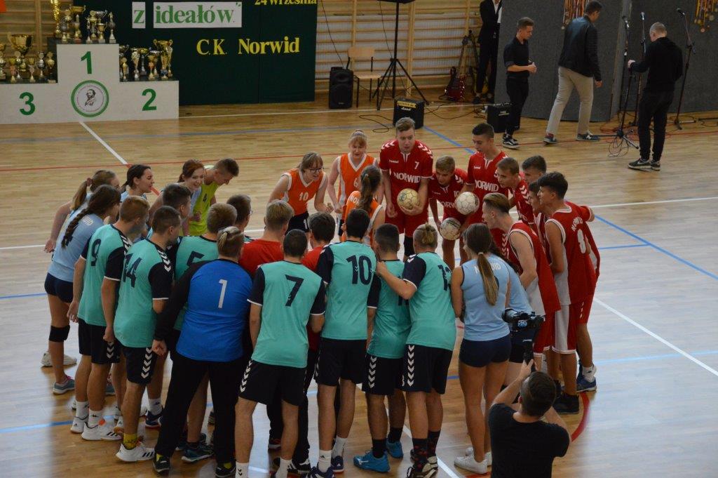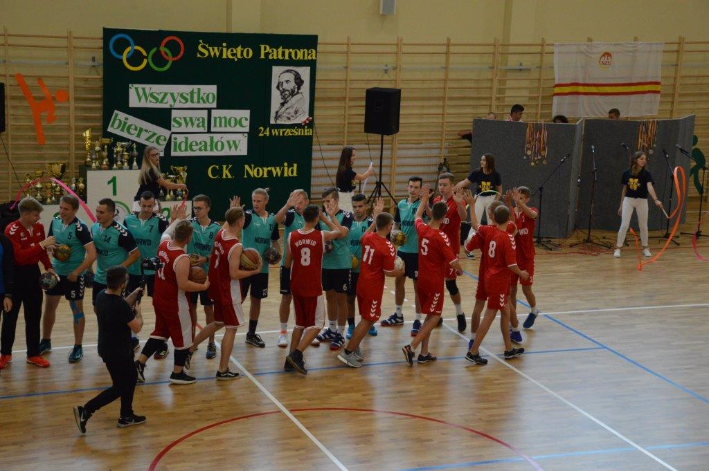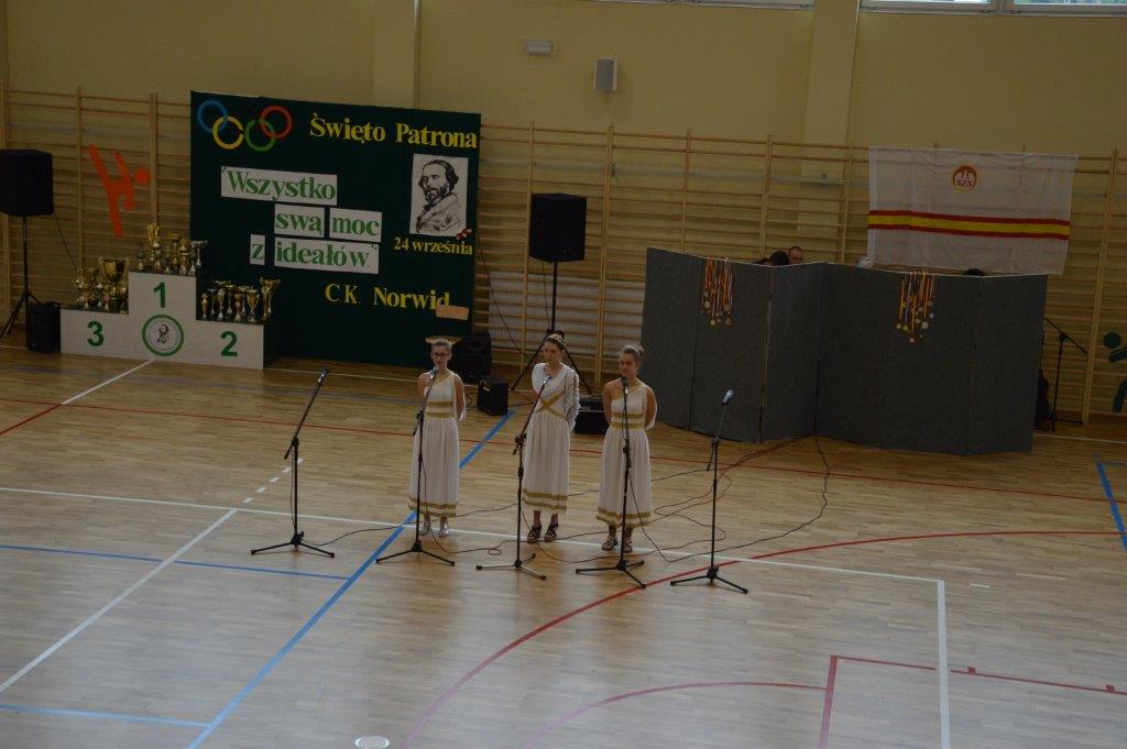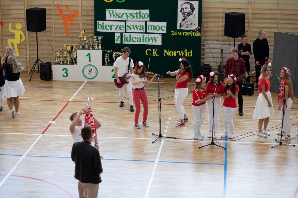 Początek uroczystości nie był standardowy. Energiczna melodia (muz. Magic System) i słowa piosenki autorstwa p. Justyny Kopycińskiej, pt. „Norwid Gra”, ułożonej specjalnie na tę okazję wprawiły zebraną publiczność w sportowy nastrój. Mobilizujące uczniów Norwida do aktywności fizycznej i dopingowania swych zawodników tekst i muzyka, zwiastowały typowo sportowy charakter imprezy.