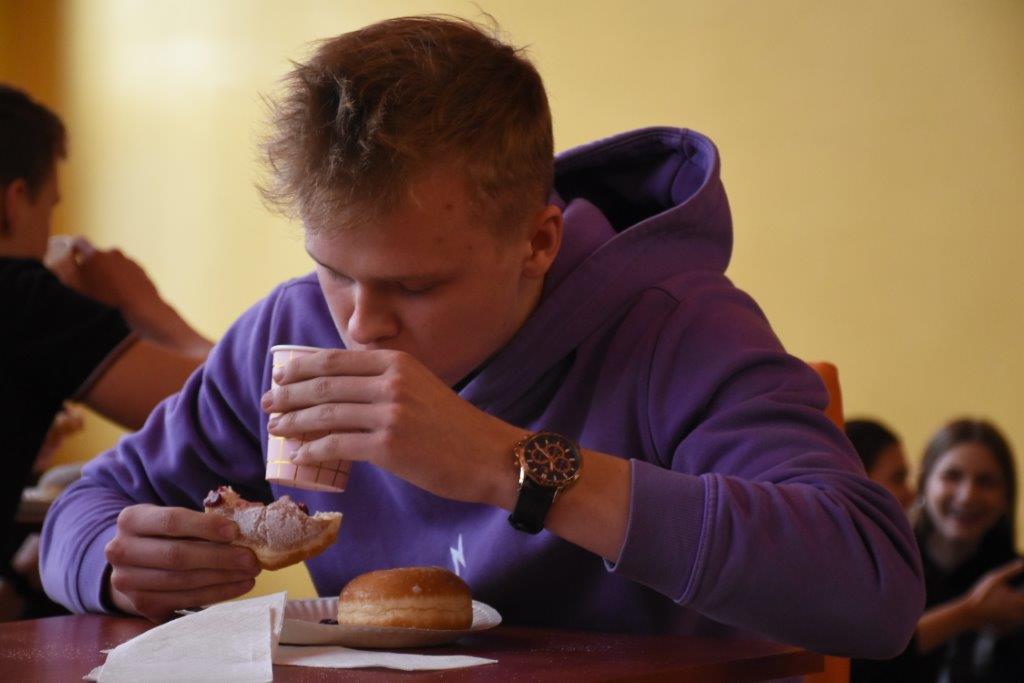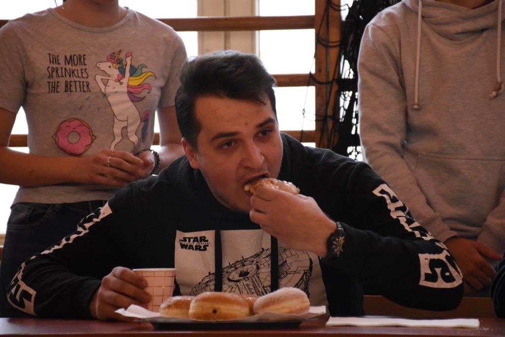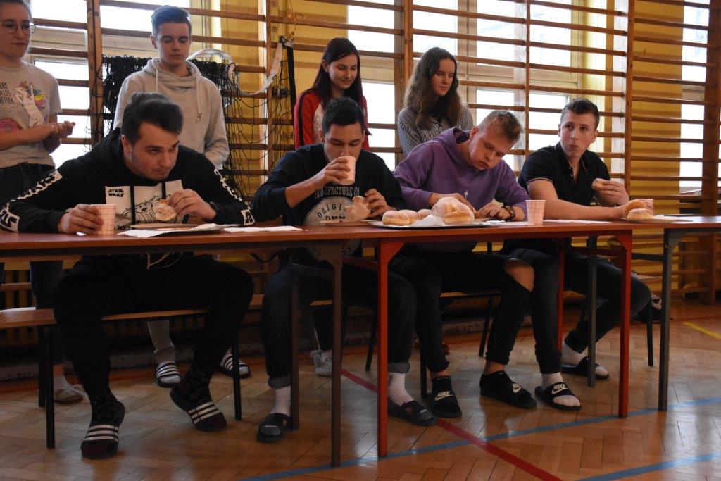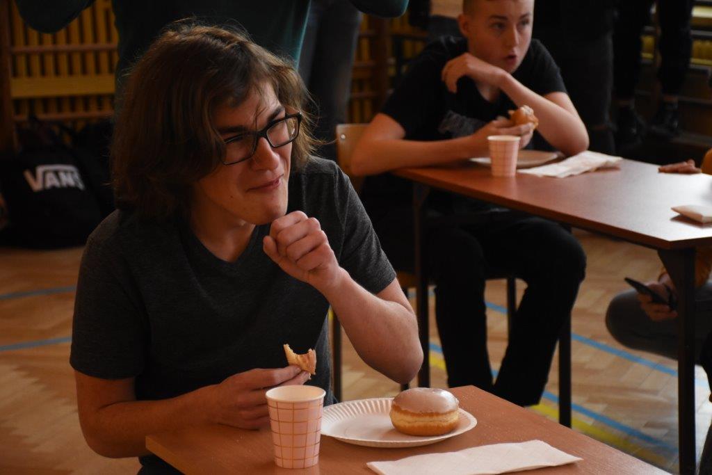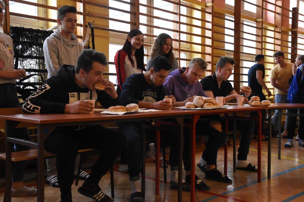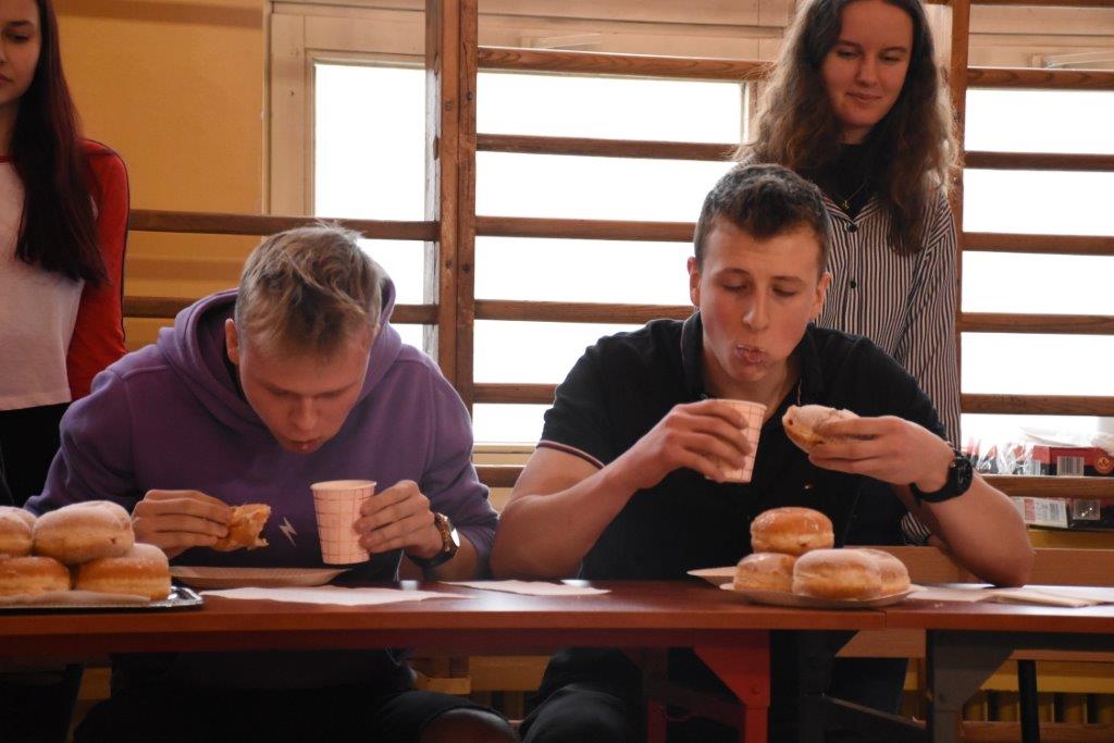 Pod czujnym okiem pani pielęgniarki, oraz okiem kamery TVP 3, zawodnicy pałaszowali kolejne smakołyki. W pierwszej rundzie, polegającej na zjedzeniu 2 pączków w jak najkrótszym czasie, triumfował Radek Gabryś z kl.3 C, który pochłonął je w 31 sekund (podczas, gdy pozostali zawodnicy potrzebowali aż 1,5 minuty). W rundzie 2, w ciągu 2 min nasz mistrz zjadł 6 pączków, zostawiając tym samym rywali daleko w tyle. Tego dnia już raczej kolejnych pączków nie konsumował...