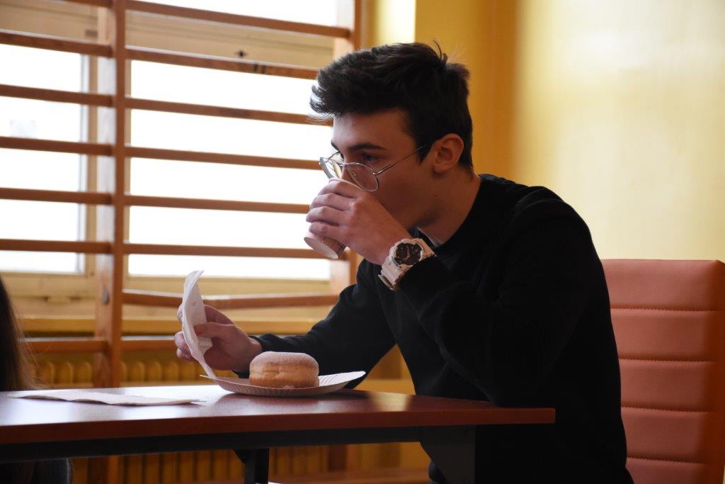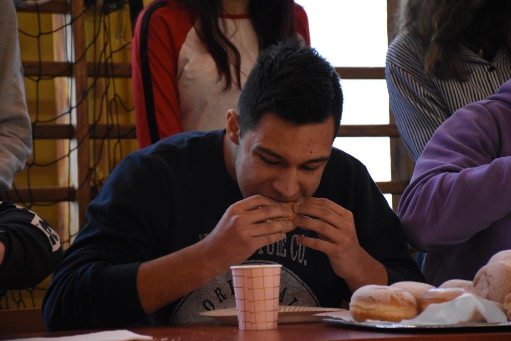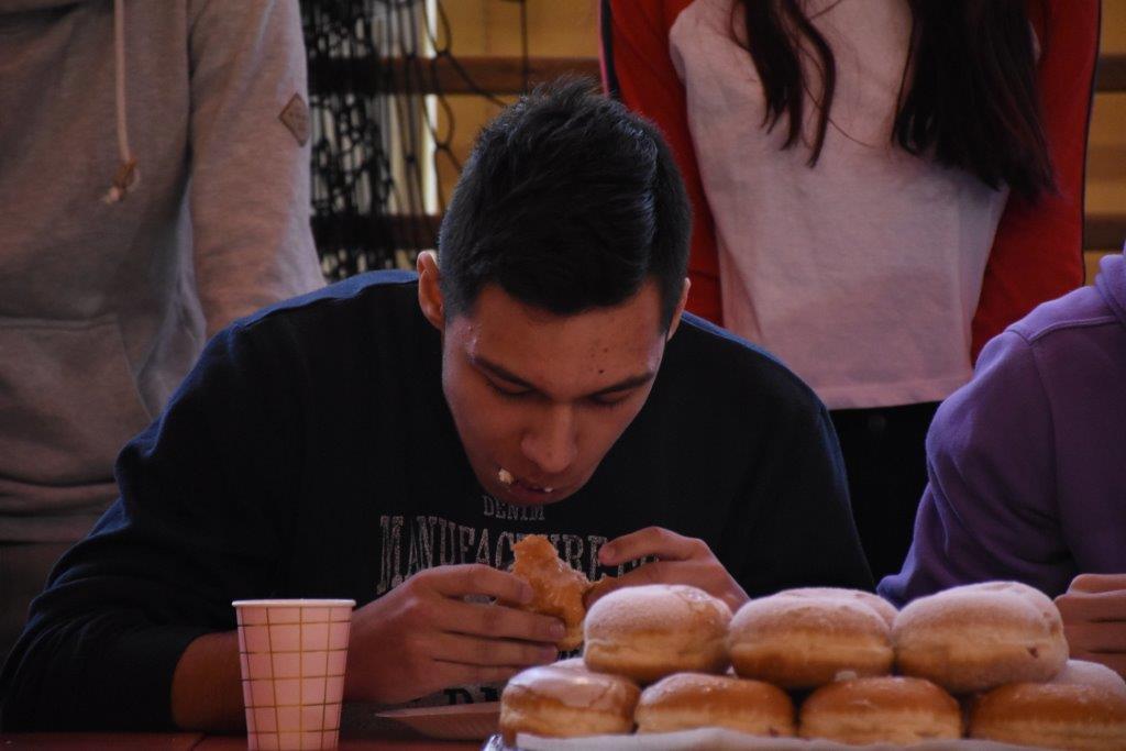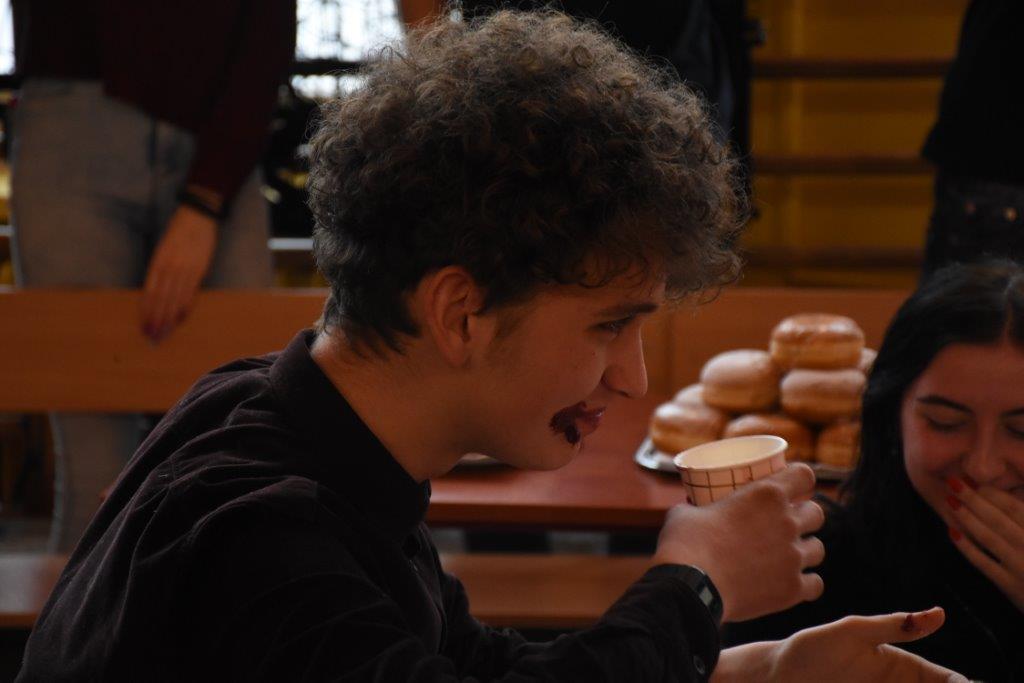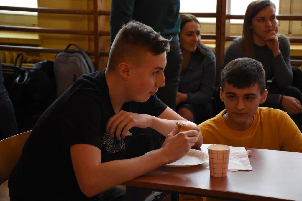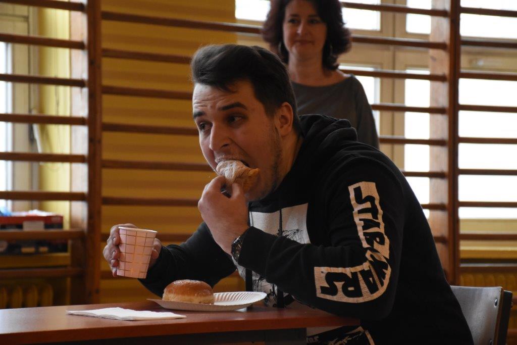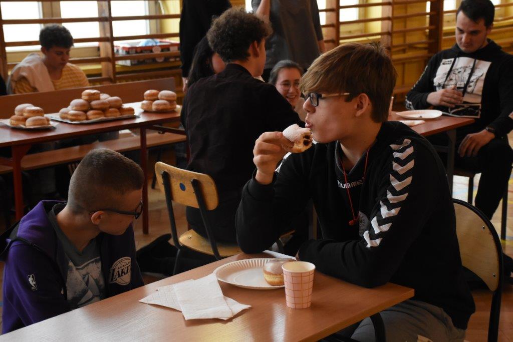 Pod czujnym okiem pani pielęgniarki, oraz okiem kamery TVP 3, zawodnicy pałaszowali kolejne smakołyki. W pierwszej rundzie, polegającej na zjedzeniu 2 pączków w jak najkrótszym czasie, triumfował Radek Gabryś z kl.3 C, który pochłonął je w 31 sekund (podczas, gdy pozostali zawodnicy potrzebowali aż 1,5 minuty). W rundzie 2, w ciągu 2 min nasz mistrz zjadł 6 pączków, zostawiając tym samym rywali daleko w tyle. Tego dnia już raczej kolejnych pączków nie konsumował...