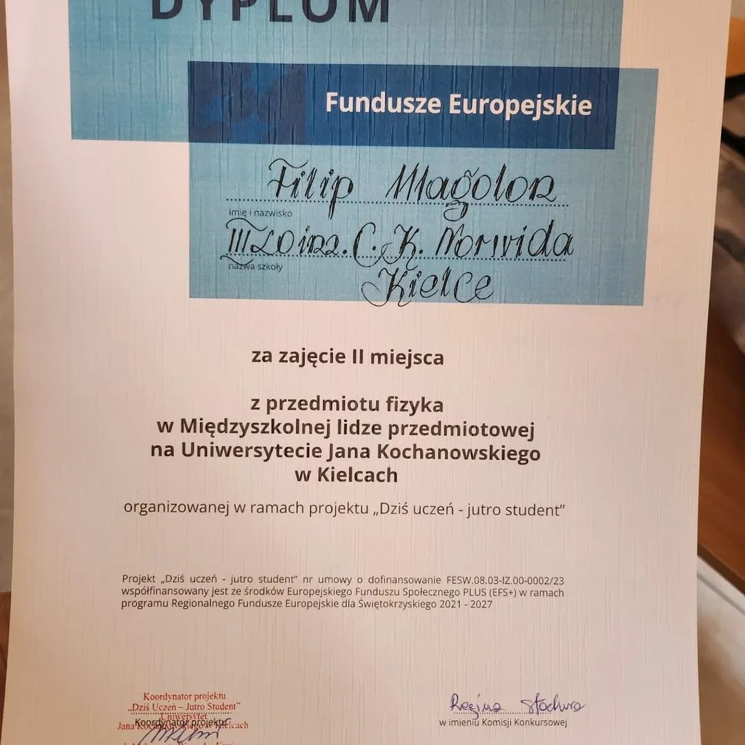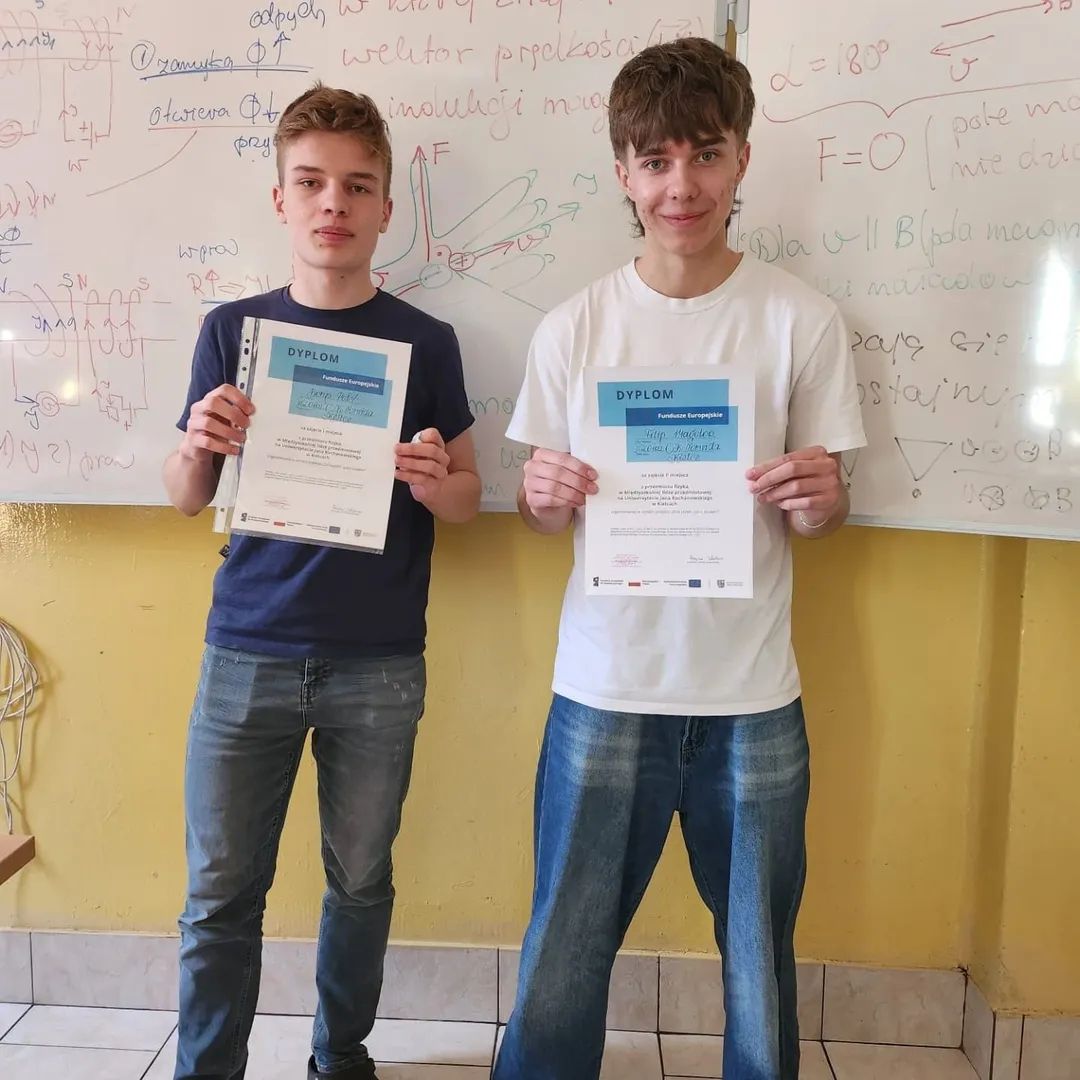 Uczniowie klasy 3A Borys Połeć i Filip Magolon zajęli 1🥇i 2🥈 miejsce z przedmiotu fizyka w Międzyszkolnej Lidze Przedmiotowej na Uniwersytecie Jana Kochanowskiego w Kielcach.