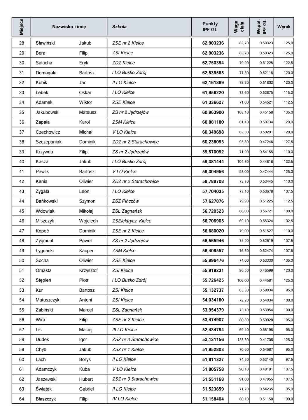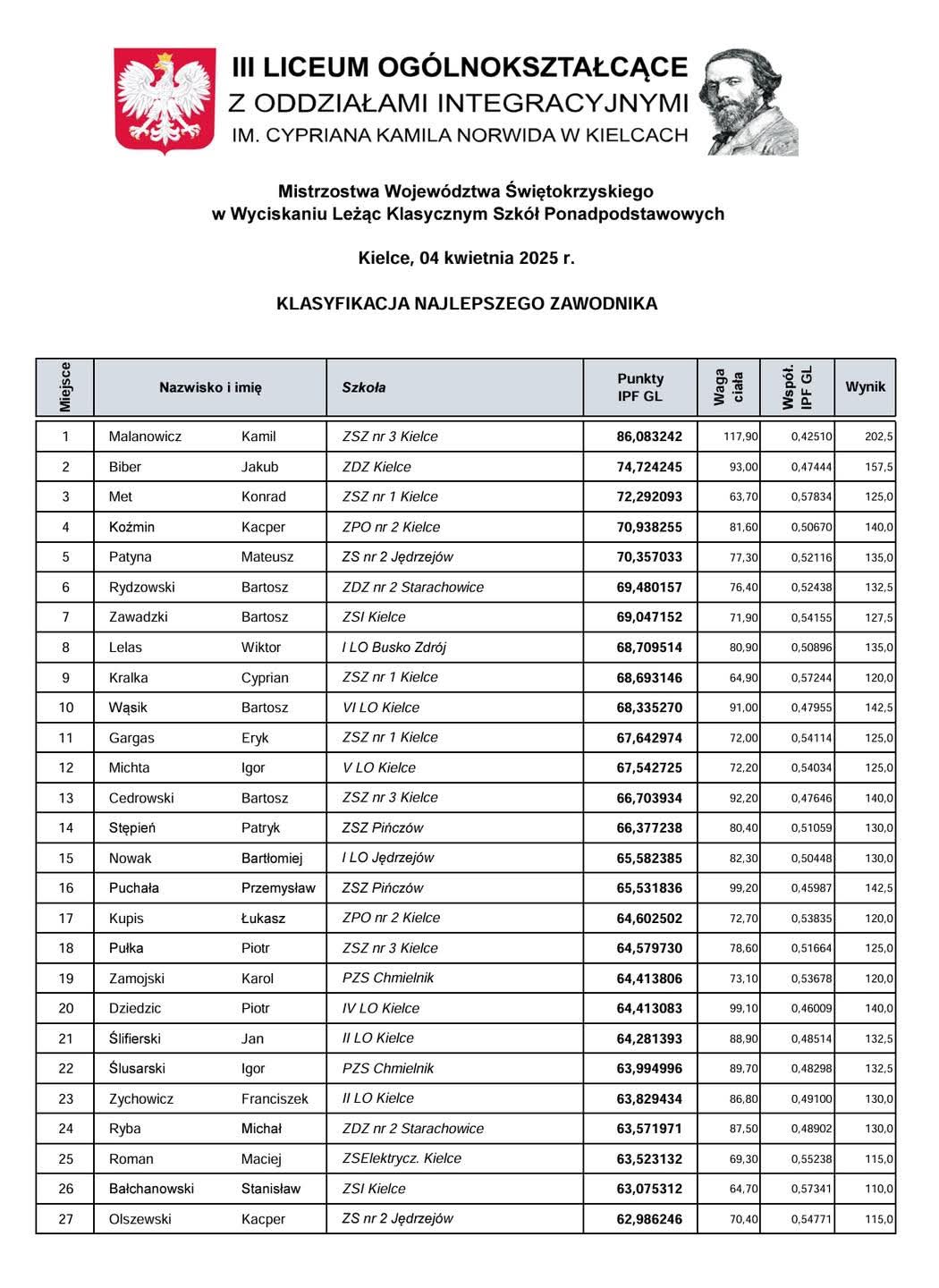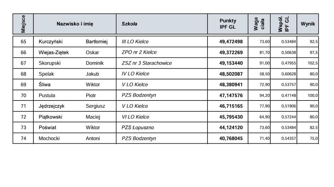 Poniżej przedstawiamy wyniki rywalizacji.