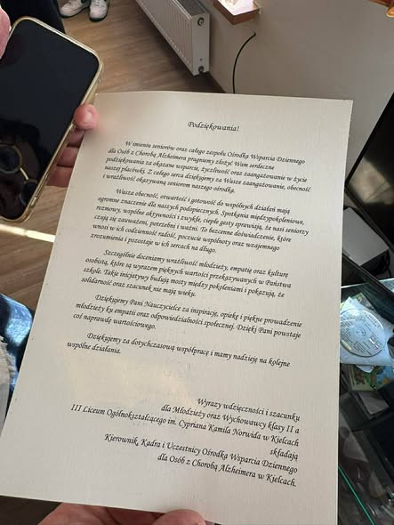 Dnia 04.03 klasa 2a wraz z wychowawcą Marzeną Kmitą odwiedziła Ośrodek Alzheimera. Uczniowie przygotowali program artystyczny „Wiosna, Wiosna” , który obejmował układ taneczny wykonany przez Maję, Karolinę i uczniów. Wszyscy zaśpiewali Wehikuł czasu zespołu Dżem, Marcelina zaśpiewała utwór „I have nothing” Whitney Houston. Zuzia, Wiktoria i Milena opracowały krzyżówki i gry umysłowe. Spotkanie przebiegło w radosnej atmosferze i pokazało, że integracja międzypokoleniowa jest potrzebna