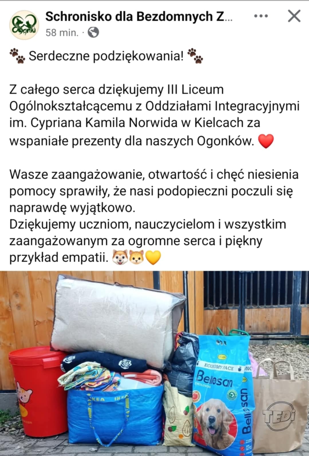 Dzięki hojności i zaangażowaniu naszej społeczności szkolnej udało nam się zgromadzić dużą ilość karmy, koce, zabawki oraz niezbędne akcesoria dla zwierząt. Każda przekazana rzecz to gest wielkiego serca, który realnie poprawi byt naszych czworonożnych przyjaciół.
