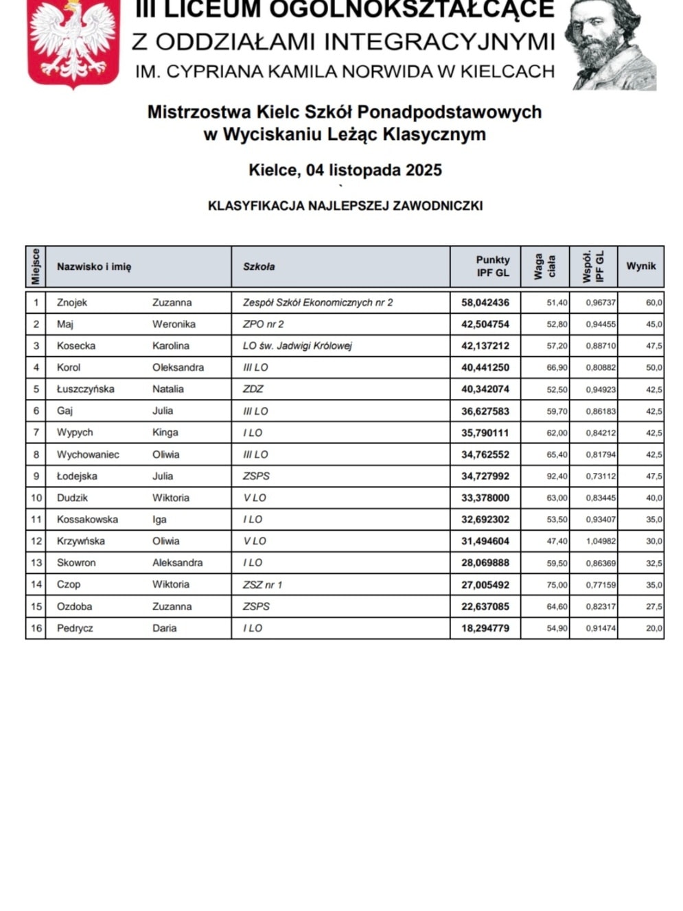 Kalina Pietyra 10 pkt., Lena Kuca 7 pkt., Amelia Ciesiun 6 pkt., Maja Smardzewska 2 pkt., Alicja Wójcicka 1 pkt.