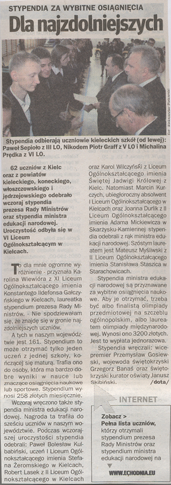 Uczniem III Liceum Ogólnokształcącego, który otrzymał Stypendium był Paweł Sepioło uczeń klasy III D.